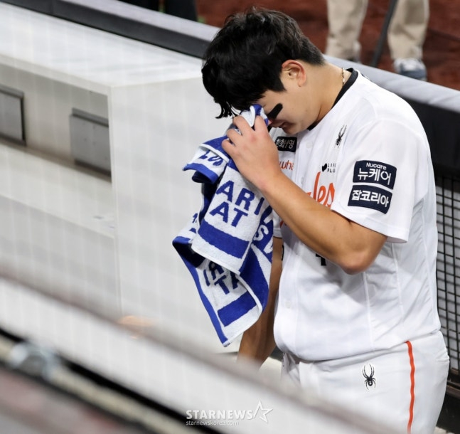 한화의 승리가 확정된 순간 더그아웃에서 지켜보는 김서현의 눈에서는 뜨거운 눈물이 흘렀다. 한동안 눈물을 훔치던 김서현은 자신의 이름을 연호하는 팬들을 향해 90도 인사로 고마움을 나타냈다.
