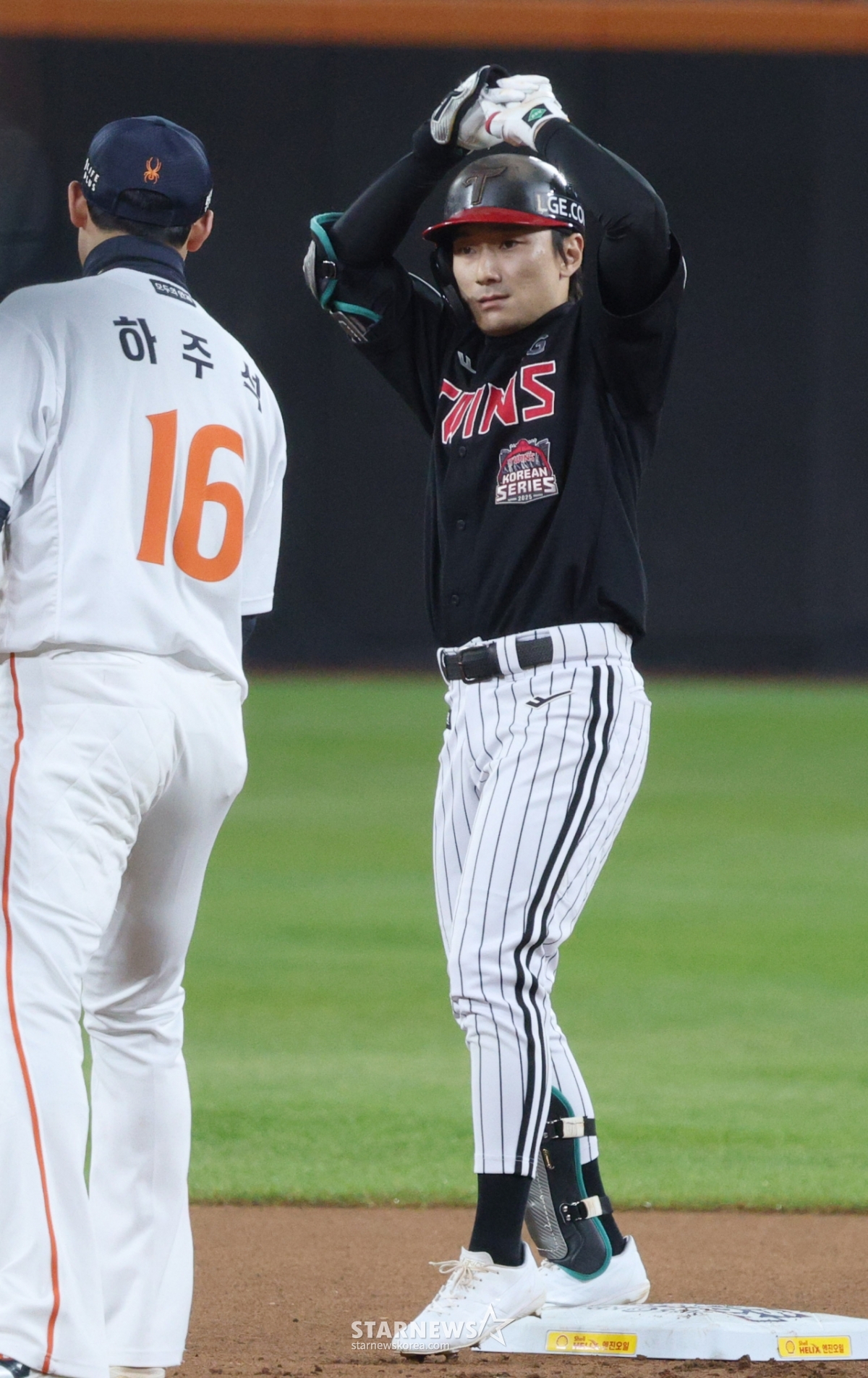 스포츠야구[포토] 신민재 '2루타로 시동'발행 : 2025.10.31 ・ 18:44대전=김진경 대기자2025 KBO리그 한국시리즈 5차전 한화 이글스 대 LG 트윈스전이 31일 대전 한화생명 볼파크에서 열렸다.LG 신민재가 1회초 1사에서 좌월 2루타를 날리고 출루한 후 세리머니를 하고 있다.<저작권자 © 스타뉴스, 무단전재 및 재배포 금지>프로야구KBO톨허스트문동주박동원정민철추천 기사김진경 대기자기자홈좋아요 스포츠-야구의 인기 급상승 뉴스스포츠-야구의 최신 뉴스