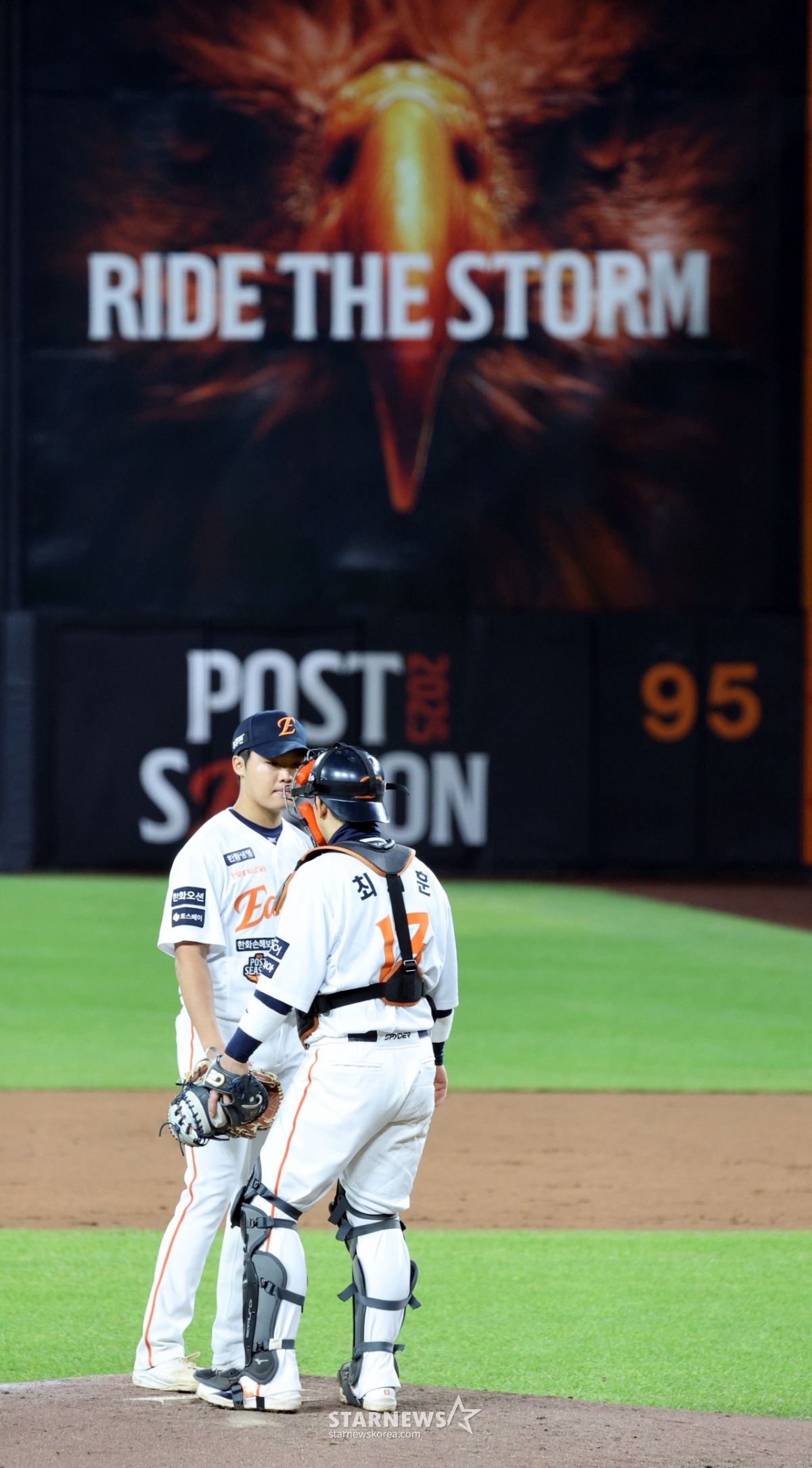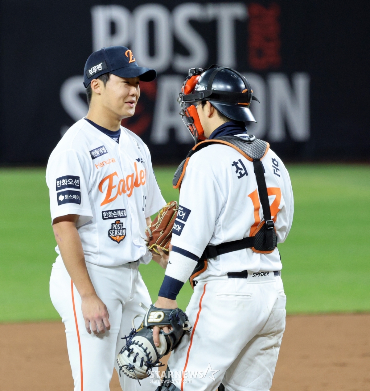 한화 정우주가 31일 대전한화생명볼파크에서 열린 2025KBO리그 한화이글스와 LG트윈스의 한국시리즈5차전 3회초 만루위기에 몰리자 최재훈 포수가 마운드에 올라 다독이고 있다. 2025.10.31.