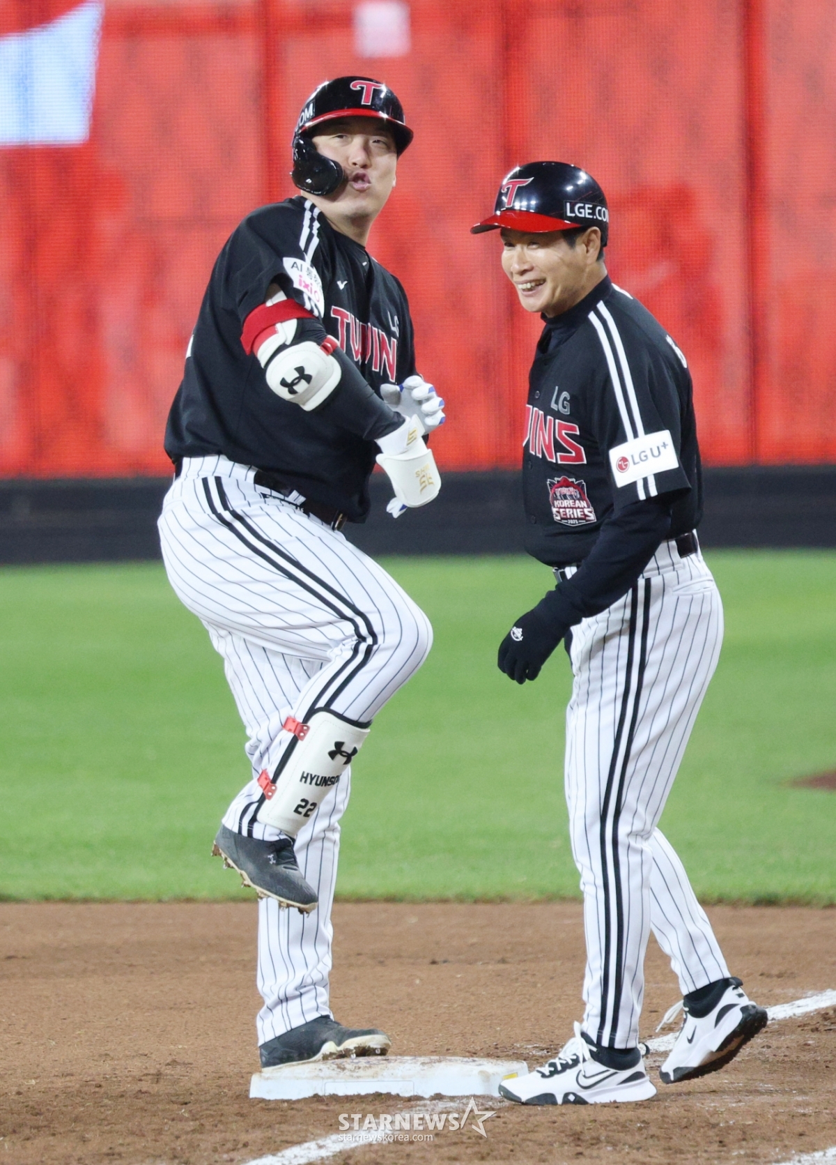 스포츠야구[포토] 김현수 '우승 세리머니 기억하자'발행 : 2025.10.31 ・ 20:40대전=김진경 대기자2025 KBO리그 한국시리즈 5차전 한화 이글스 대 LG 트윈스전이 31일 대전 한화생명 볼파크에서 열렸다.LG 김현수가 6회초 1사 2루에서 1타점 적시타를 날리고 출루한 후 송지만 코치와 기뻐하고 있다.<저작권자 © 스타뉴스, 무단전재 및 재배포 금지>프로야구KBO톨허스트문동주박동원정민철추천 기사김진경 대기자기자홈좋아요 스포츠-야구의 인기 급상승 뉴스스포츠-야구의 최신 뉴스