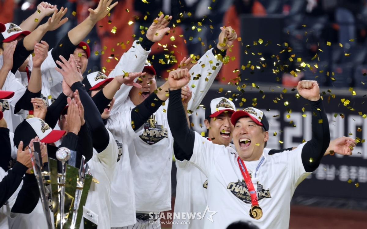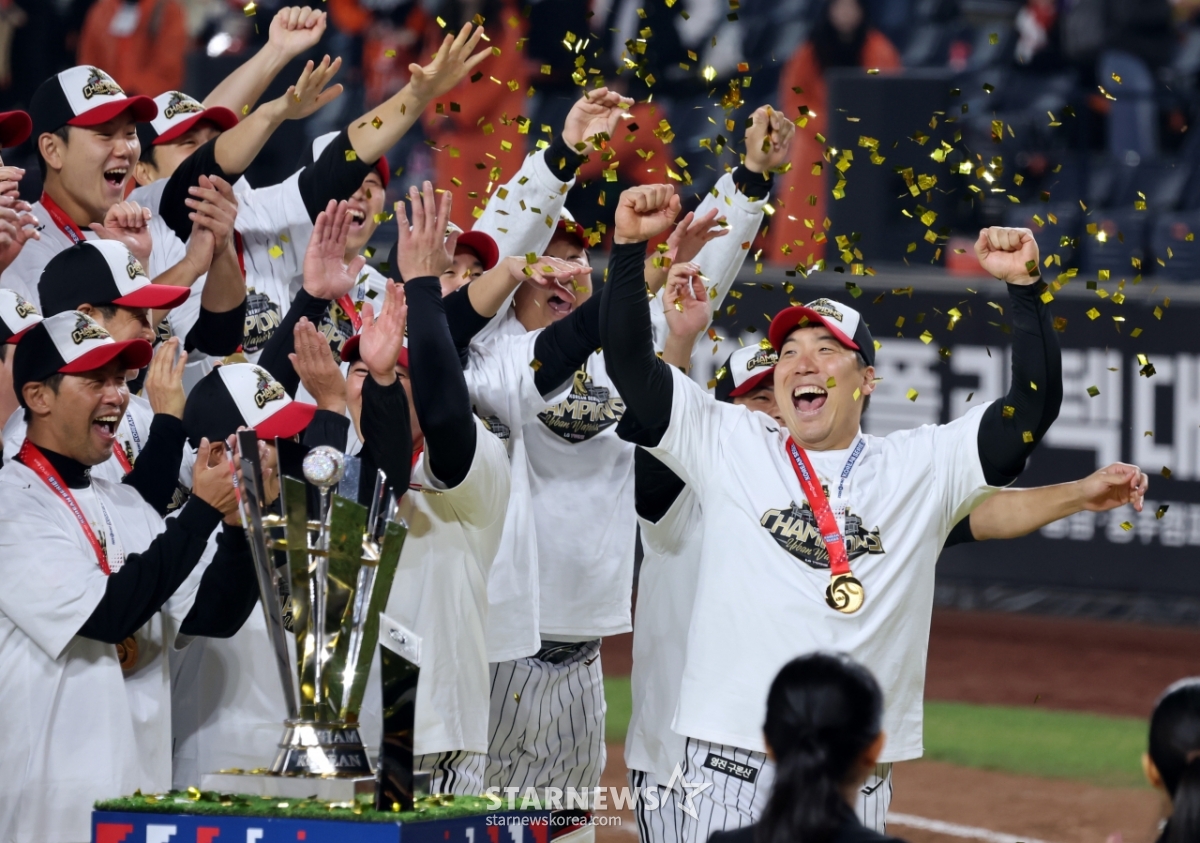 LG MVP 김현수가 31일 대전한화생명볼파크에서 열린 2025KBO리그 한화이글스와 LG트윈스의 한국시리즈5차전에서 승리한 후 시상식에서 자신의 이름이 호명되자 환호하고 있다. 2025.10.31.