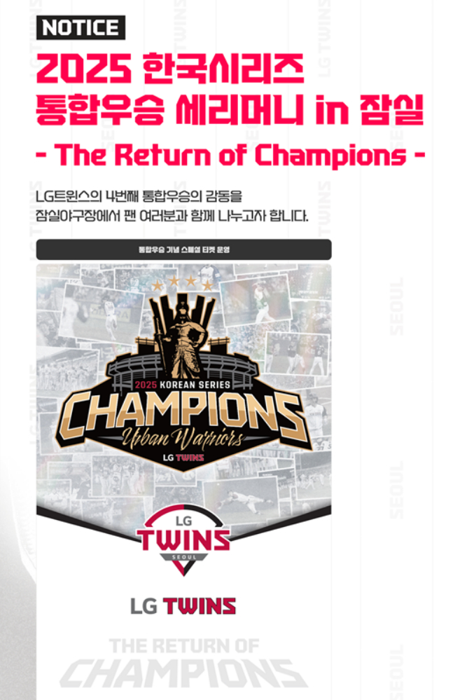 한편, LG 트윈스는 이번 통합우승을 원정 경기에서 달성함에 따라, 그 감동을 팬들과 함께 나누기 위해 잠실야구장에서 '한국시리즈 통합우승 IN 잠실' 행사를 개최한다. 행사는 11월 1일 오후 6시 30분부터 진행된다.