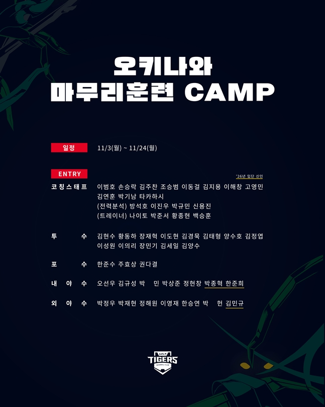 1일 KIA 구단에 따르면 이번 마무리 훈련에는 2026년 신인 선수 3명(내야수 박종혁, 내야수 한준희, 외야수 김민규)을 포함해 30명의 선수가 참가해 4일 훈련 1일 휴식의 일정으로 체력 및 기술 훈련을 소화할 예정이다. 코칭스태프 역시 이범호 감독을 포함해 19명이 훈련을 지휘하게 된다.