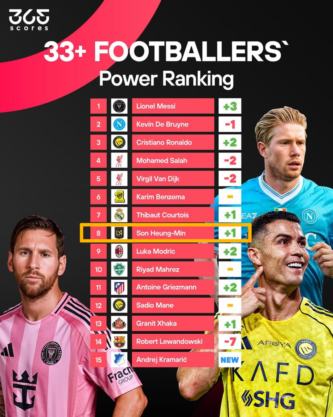 손흥민은 축구 매체 365스코어스가 1일(한국시간) 공개한 33세 이상 축구선수 10월 파워랭킹에서 8위에 랭크됐다. 지난달 9위에서 한 달 새 순위가 1계단 올랐다.