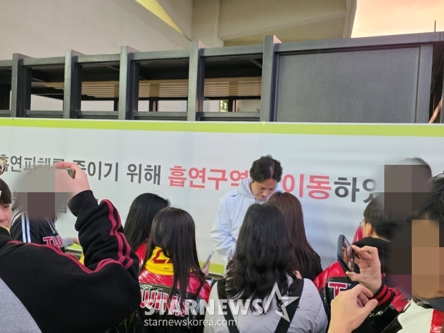 덕분에 3루 쪽 입장 게이트에서는 김진성을 향한 뜨거운 사진 촬영 경쟁이 이어졌다. 함께 자리한 장현식, 유영찬, 손주영, 함덕주는 "저기에 김진성 있어요"라고 팬들을 몰아주면서 우승 주역을 한껏 추켜세웠다.