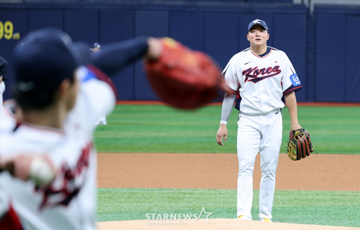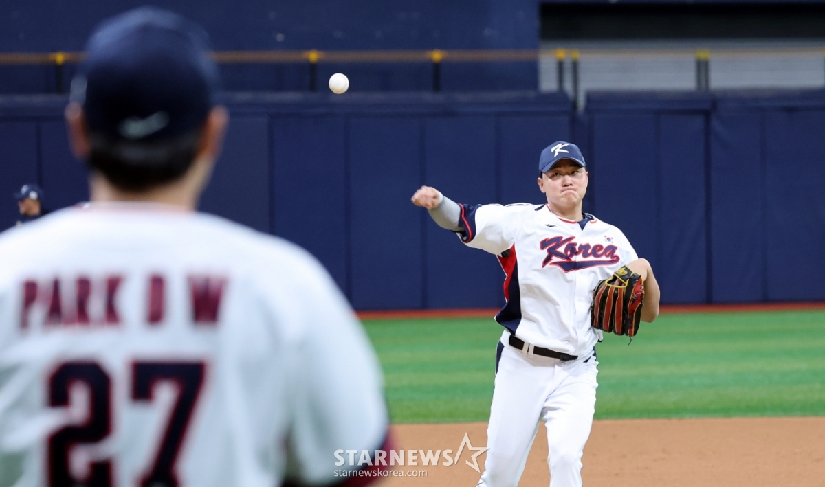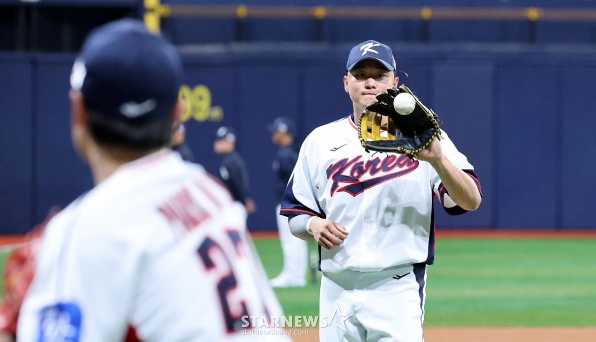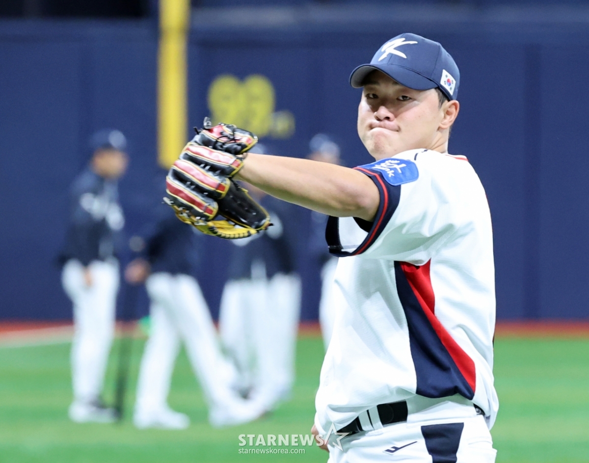 야구대표팀 이재원이 4일 고척스카이돔에서 열린 2026 WBC 야구대표팀 훈련에 합류해 캐비볼을 하고 있다. 갑작스런 합류로 한동희 유니폼을 입고 훈련에 집중하고 있다. 2025.11.04.