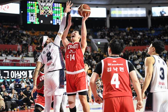 SK는 4일 잠실학생체육관에서 열린 2025~2026시즌 LG전자 프로농구 정규리그 맞대결에서 부산KCC를 76-68로 제압했다.