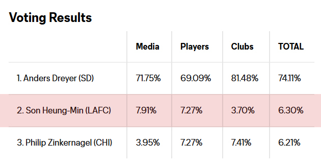 손흥민은 현지 미디어 투표에서 7.91%, MLS 현역 선수와 각 구단 기술 스태프 투표에선 각각 7.27%와 3.7% 등 평균 6.3%의 지지를 받는 데 그쳤다.