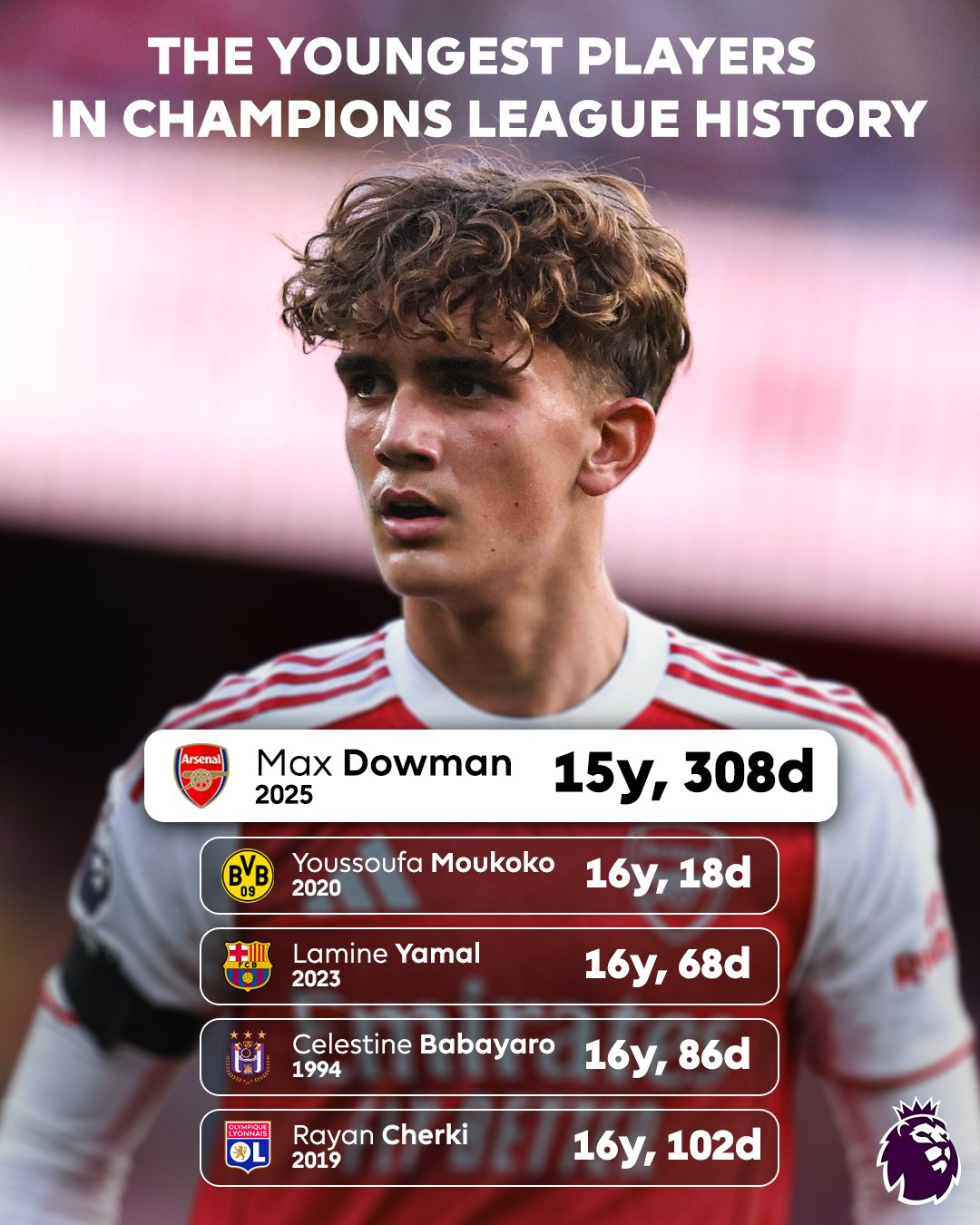 잉글랜드 프리미어리그(EPL) 아스날의 기대주 맥스 다우먼이 15세 308일의 나이로 유럽축구연맹(UEFA) 챔피언스리그(UCL) 무대에 데뷔했다.