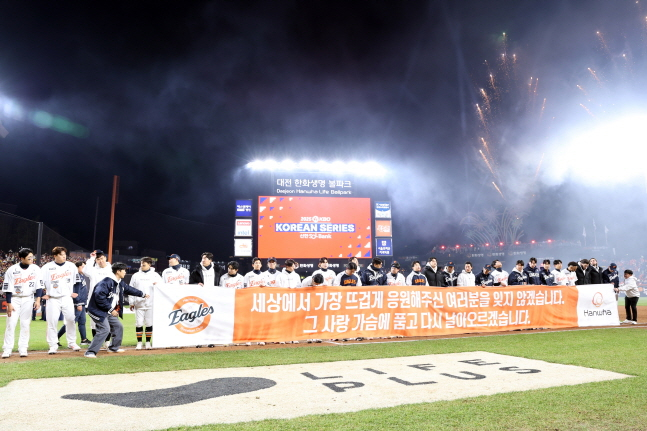 3차전 8회초가 끝난 뒤 한화 관계자는 "결과에 상관없이 경기 종료 후 불꽃 공연을 진행한다"며 "팀이 (KS에서) 열세에 놓인 상황에서도 승리를 위해 끝까지 함께하는 팬들과 선수단에 감사의 뜻을 표하려는 김승연 구단주의 의지"라고 전했다. 공교롭게도 한화는 8회말 6점을 내며 대역전승을 이뤄냈다.