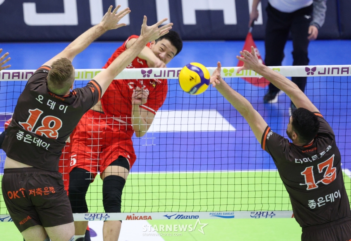 스포츠일반[포토] 신영석 '외인 군단 갈랐다'발행 : 2025.11.06 ・ 19:47수정 : 2025.11.06 ・ 19:49수원=김진경 대기자2025-2026시즌 V리그 남자부 한국전력 대 OK저축은행 경기가 6일 경기도 수원체육관에서 열렸다.한국전력 신영석이 OK저축은행 오데이와 디미트로프의 더블 블로킹 사이로 강스파이크를 날리고 있다.<저작권자 © 스타뉴스, 무단전재 및 재배포 금지>프로배구V리그코보KOVOOK저축은행읏맨추천 기사김진경 대기자기자홈좋아요 스포츠-일반의 인기 급상승 뉴스스포츠-일반의 최신 뉴스
