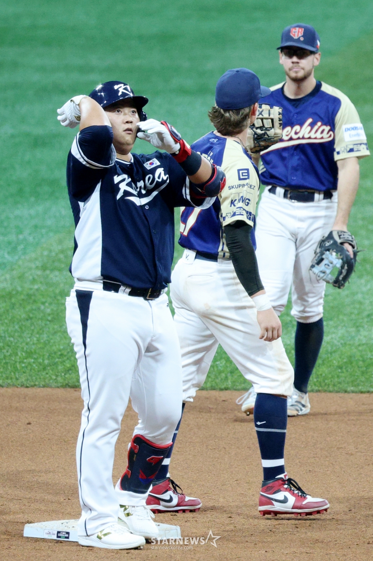 한국 한동희가 9회초 2사 2루에서 1타점 적시 2루타를 날리고 출루한 후 세리머니를 하고 있다.