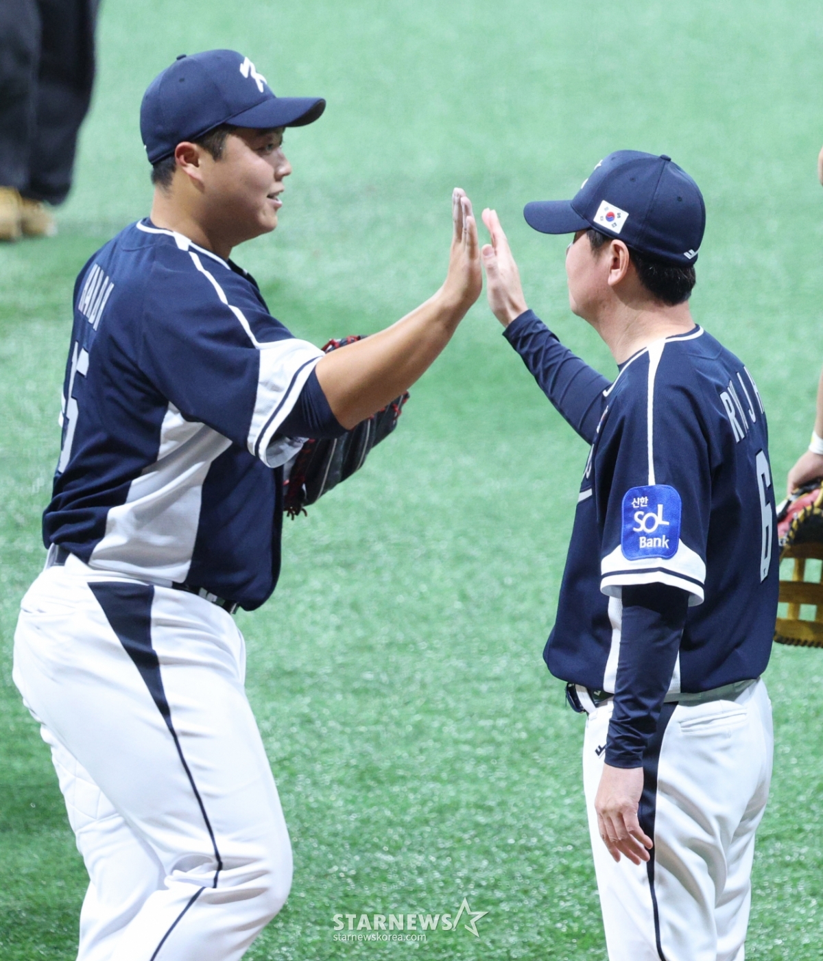 한국 선수들이 체코에 11-1 대승을 거둔 후 기쁨을 나누고 있다. 한동희가 류지현 감독과 하이파이브하고 있다.