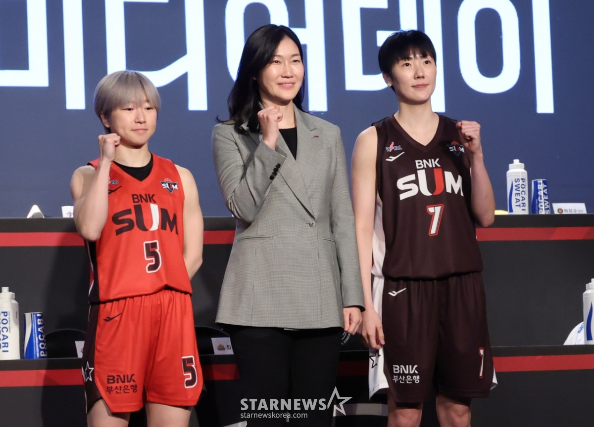 BNK 썸 안혜진(왼쪽부터), 박정은 감독 박혜진이 입장을 하며 포즈를 취하고 있다.