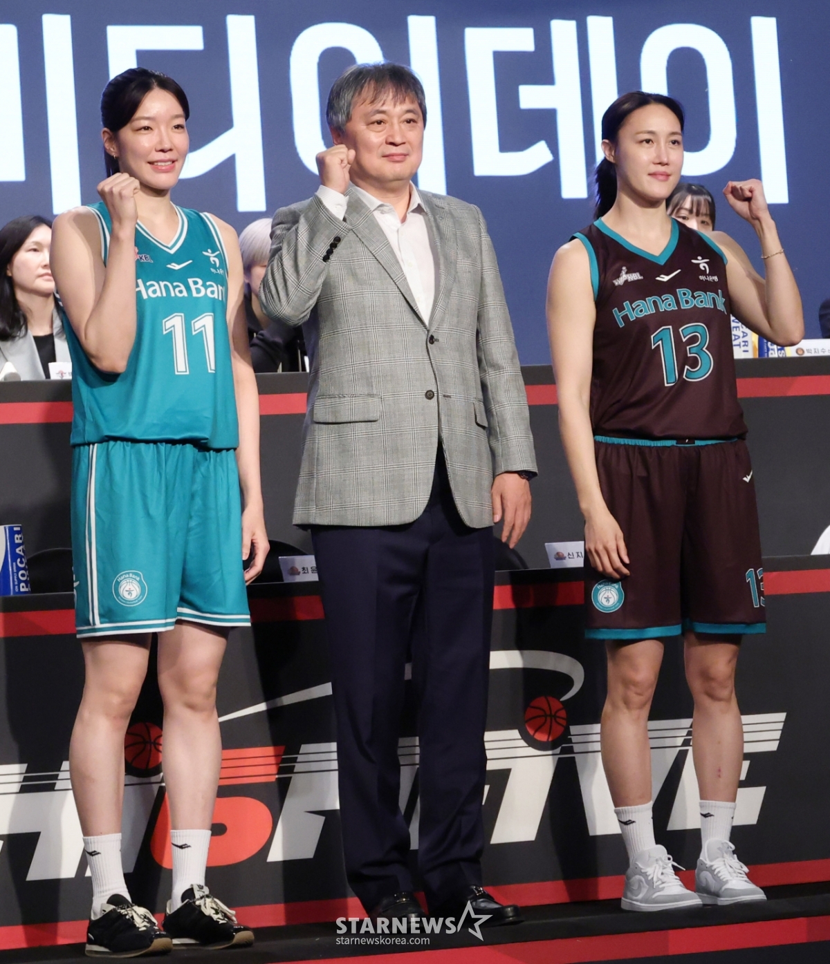하나은행 양인영(왼쪽부터), 이상범 감독 김정은이 입장을 하며 포즈를 취하고 있다.