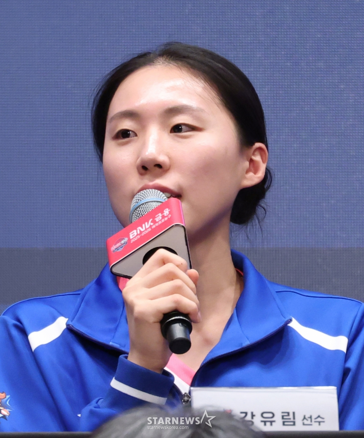삼성생명 강유림이 기자들의 질문에 답하고 있다.