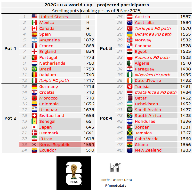 사실 한국은 매우 유리한 위치다. 개최국(미국·멕시코·캐나다)이 포트1에 자동 배정되고, 월드컵 본선 직행이 어려운 FIFA 랭킹 상위팀을 제외하면 FIFA 랭킹 24위가 포트2 커트라인이 될 가능성이 크다. 한국은 10월 기준 FIFA 랭킹 22위, 랭킹 포인트는 1594점이다. 그 뒤를 23위 에콰도르(1590점), 24위 오스트리아(1587점), 25위 호주(1584점)가 잇고 있다. 네 팀 중 세 팀이 포트2에 속하고, 한 팀만 포트3으로 떨어진다. 순위가 가장 높은 한국의 포트2 사수 가능성이 현재로선 크다.