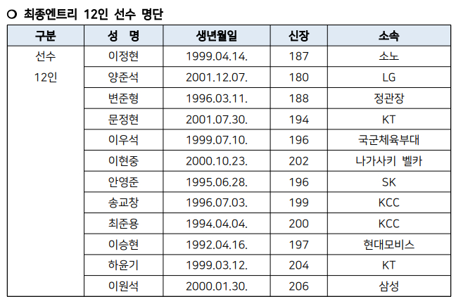 이어 "문정현은 지난 8월 열린 괌 대표팀과 2025 FIBA 아시아컵 8강 진출전서 18득점 8리바운드 4스틸을 기록했다. 팀 승리에 기여한 바 있는 선수로 경기 MVP(최우수 선수)로 선정된 바 있다. 꾸준히 국가대표로 선발되어 국제대회 경험을 쌓아온 만큼 대표팀에 힘을 더할 전망"이라고 덧붙였다.