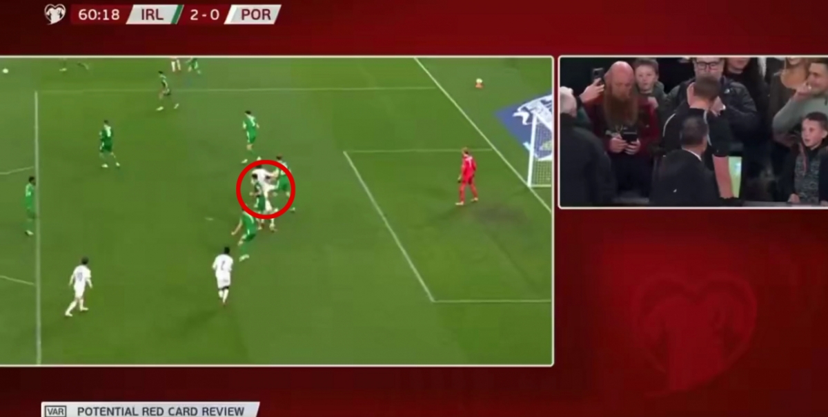 호날두는 공과 상관이 없는 상황에서 신경질적으로 팔꿈치를 강하게 휘둘러 오셰이를 가격했고, 오셰이는 그대로 쓰러졌다. 당초 주심은 옐로카드를 줬으나 비디오판독(VAR) 온필드 리뷰를 거쳐 레드카드로 정정됐다. A매치 226경기 출전 만에 받은 호날두의 첫 퇴장이자 불필요하게 받은 황당한 레드카드이기도 했다.