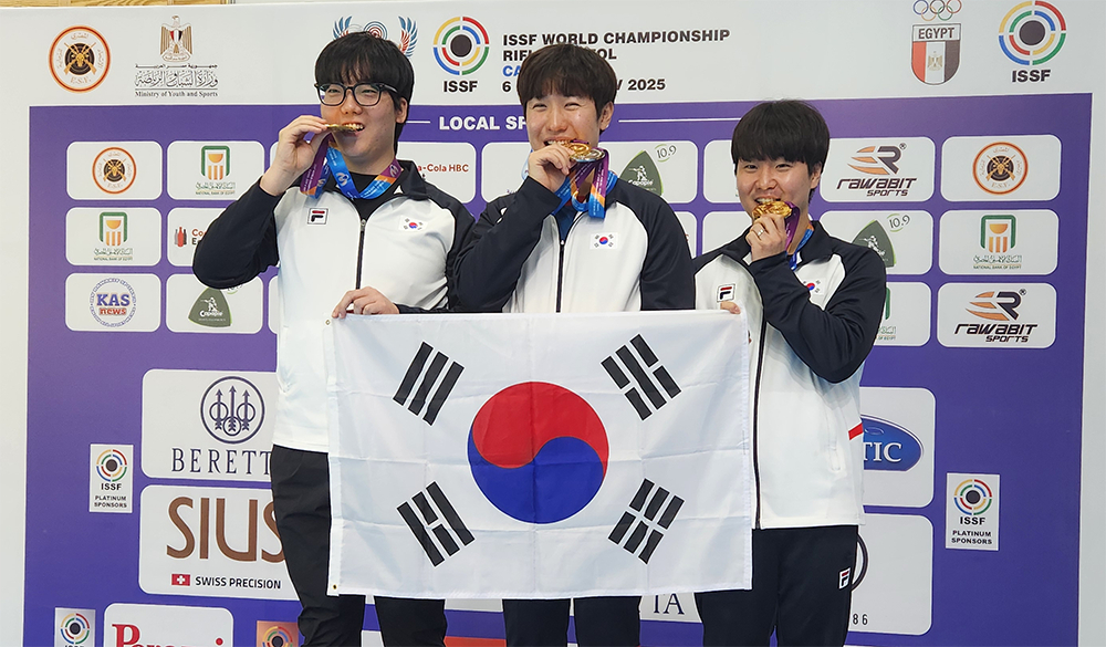 16일 대한사격연맹에 따르면 조영재와 박정이(이상 경기도청)와 이건혁(KB국민은행)으로 이뤄진 남자 사격 대표팀은 현지시간으로 15일 이집트 카이로 국제올림픽시티 사격장에서 열린 2025 국제사격연맹(ISSF) 세계선수권대회에서 단체전 금메달을 차지했다.
