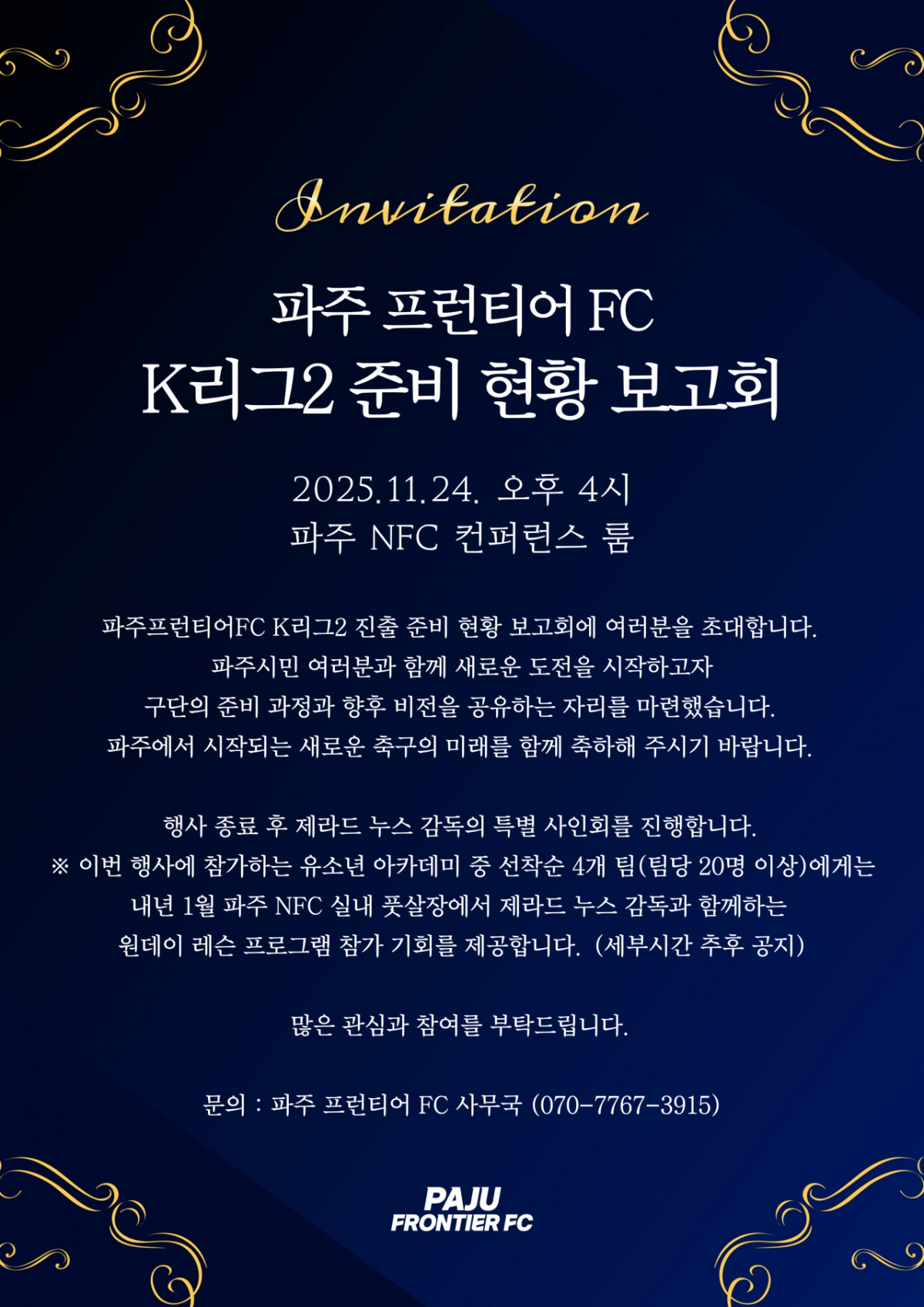 이번 보고회는 파주 프런티어 FC가 창단 과정에서부터 강조해 온 시민 참여 방식의 연장선으로 구단의 비전과 엠블럼을 처음으로 공식 발표하는 자리다. 김경일 파주시장을 비롯해 김정열 이사장, 황보관 단장, 제라드 누스 감독 등 주요 관계자가 참석해 구단 운영 방향과 K리그2 진입 로드맵을 설명할 예정이다.