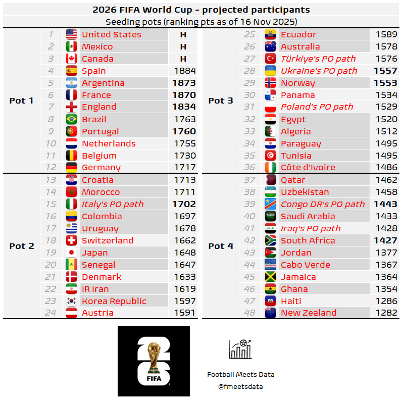 당초 이탈리아를 포함한 유럽 PO 진출팀들은 FIFA 랭킹과 상관없이 자동으로 포트 4로 배정되는 게 유력했다. 그러나 최근 유럽 PO 각 대진의 FIFA 랭킹 상위팀 기준으로 포트가 사전 배정될 거란 루머가 돌고 있다. 이탈리아가 속한 PO 대진이 상위 포트로 배정된 채 조 추첨이 진행되면, 결국 11월 FIFA 랭킹 24위는 포트 3으로 떨어질 수 있다. 각종 변수를 지우기 위해선 결국 FIFA 랭킹 23위 내 안착이 중요하다.
