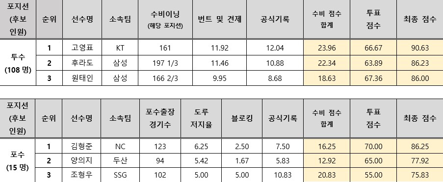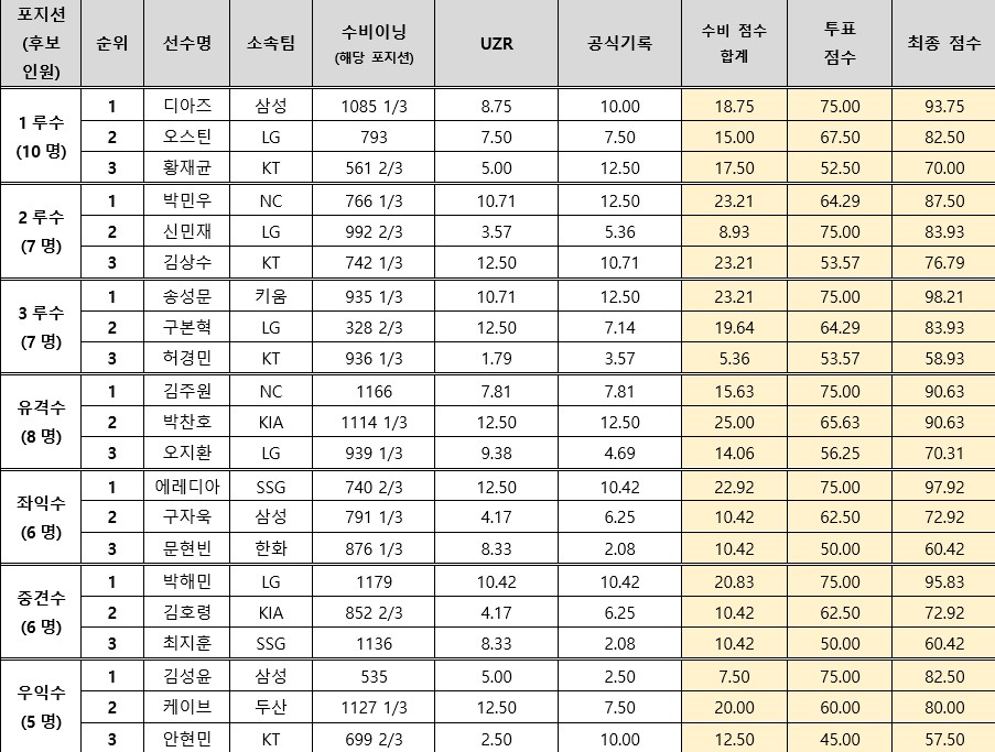최근 국가대표에서 좋은 활약을 보여준 김주원(22·NC 다이노스)이 웃었다. 김주원은 투표 점수 75점, 수비 기록 점수 15.63점으로 총점 90.63점을 획득했다. 박찬호는 투표 점수 65.63점과 수비 기록 점수 25점으로 총점 90.63점을 기록해 동률을 이뤘다. 총점이 같을 경우 투표 점수 우위 선수가 앞선다는 선정 기준에 따라 김주원이 1위, 박찬호가 2위에 선정됐다. 총점 70.31점을 기록한 오지환이 3위를 차지했다.
