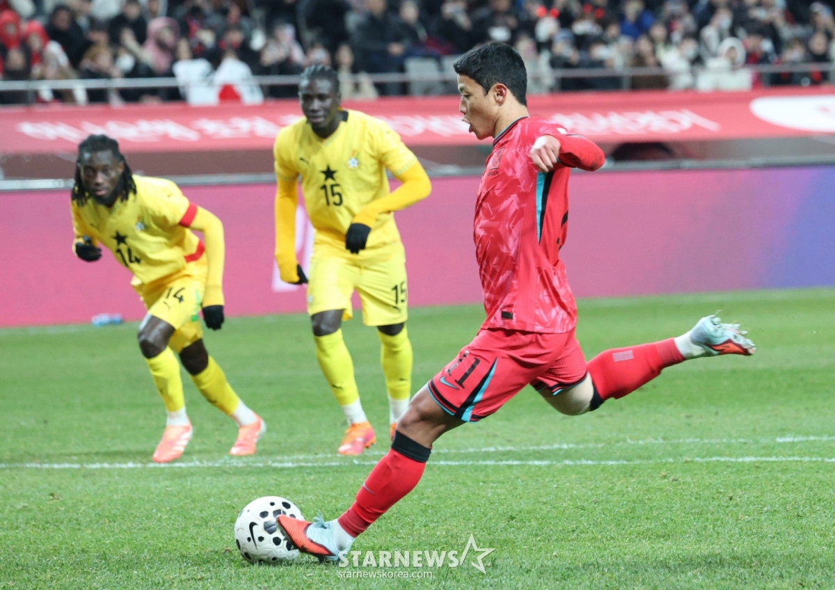스포츠축구[포토] 황희찬 '페널티킥 폼은 우아했으나'발행 : 2025.11.18 ・ 21:42상암=김진경 대기자축구 국가대표 A매치 친선경기 대한민국과 가나의 경기가 18일 서울월드컵경기장애서 열렸다.한국 횡희찬이 자신이 얻은 페널티킥을 시도했으나 가나 GK 아사레의 선방에 막혀 실패하고 있다.<저작권자 © 스타뉴스, 무단전재 및 재배포 금지>브리핑대한민국과 가나의 A매치 친선경기가 서울 월드컵경기장에서 열렸으며, 한국은 페널티킥을 얻었으나 골키퍼 아사레의 선방으로 득점에 실패했다.추천 기사김진경 대기자기자홈좋아요스포츠-축구의 인기 급상승 뉴스스포츠-축구의 최신 뉴스