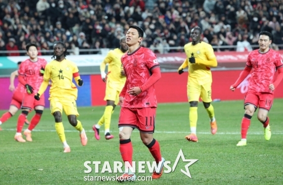 이날 벤치에서 경기를 시작한 황희찬은 1-0으로 앞선 후반 17분 손흥민과 교체돼 그라운드를 밟았다. 측면에서 부지런히 움직이던 황희찬은 후반 27분 수비수 3명을 뚫는 환상적인 돌파로 페널티킥(PK)을 얻어냈다. 왼쪽 측면에서 페널티박스 돌파하는 황희찬을 가나 수비수가 잡아당겨 넘어뜨렸고 주심을 PK를 선언했다. 하지만 키커로 나선 황희찬의 슈팅을 가나 골키퍼가 방향을 읽고 잡아내 득점이 무산됐다.