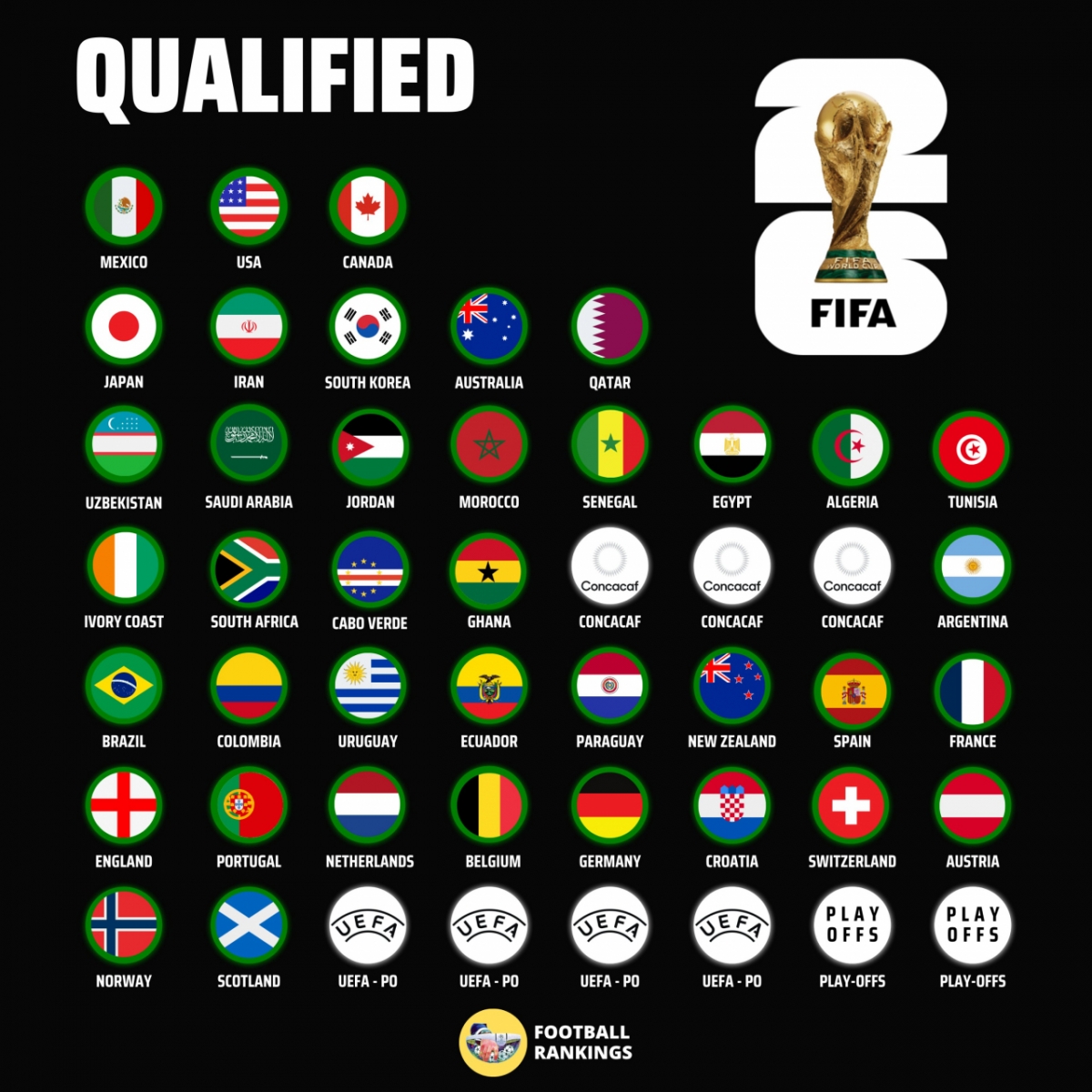 앞선 유럽 12개 팀을 비롯해 ▲아시아 대한민국, 일본, 이란, 우즈베키스탄, 요르단, 호주, 카타르, 사우디아라비아 ▲아프리카 모로코, 튀니지, 이집트, 알제리, 가나, 카보 베르데, 남아프리카공화국, 코트디부아르, 세네갈 ▲남미 아르헨티나, 브라질, 에콰도르, 우루과이, 콜롬비아, 파라과이 ▲오세아니아 뉴질랜드 ▲북중미 미국, 멕시코, 캐나다(개최국 자격)다.