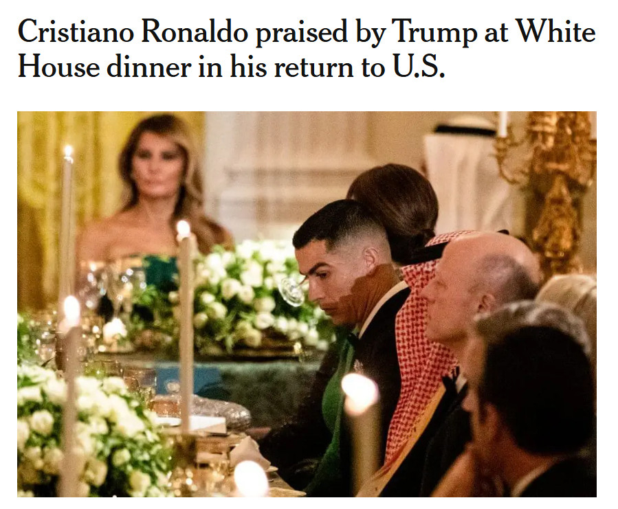 로이터 통신, ESPN 등 외신에 따르면, 호날두는 18일(현지시간) 백악관 만찬에 참석했다. 이 자리에는 트럼프 대통령과 빈 살만 사우디아라비아 왕세자, 팀 쿡 애플 최고경영자(CEO), 일론 머스크 테슬라 CEO 등도 참석했다.