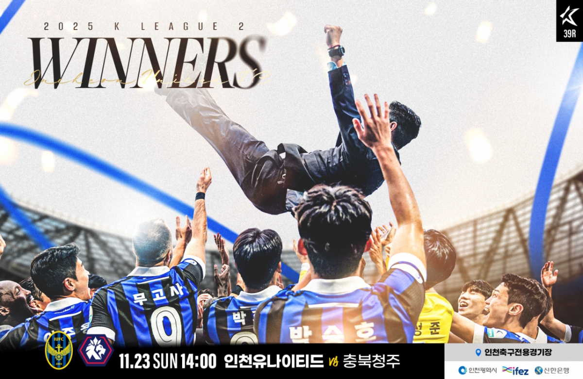 '프로축구 K리그2 챔피언' 인천 유나이티드가 오는 23일 오후 2시 인천축구전용경기장에서 충북청주FC와 하나은행 K리그2 2025 39라운드 홈경기를 치른다. 이번 경기는 시즌의 대미를 장식하는 마지막 홈경기이자, 리그 우승을 기념하는 우승 세리머니가 함께 진행되는 특별한 날이다.