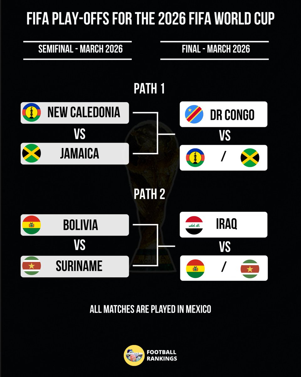 ▲뉴칼레도니아-자메이카전 승리팀과 콩고민주공화국(패스1) ▲볼리비아-수리남전 승리팀과 이라크(패스2)가 토너먼트를 통해 패스당 1장씩 걸린 월드컵 본선 진출 경쟁을 벌이는 방식이다.