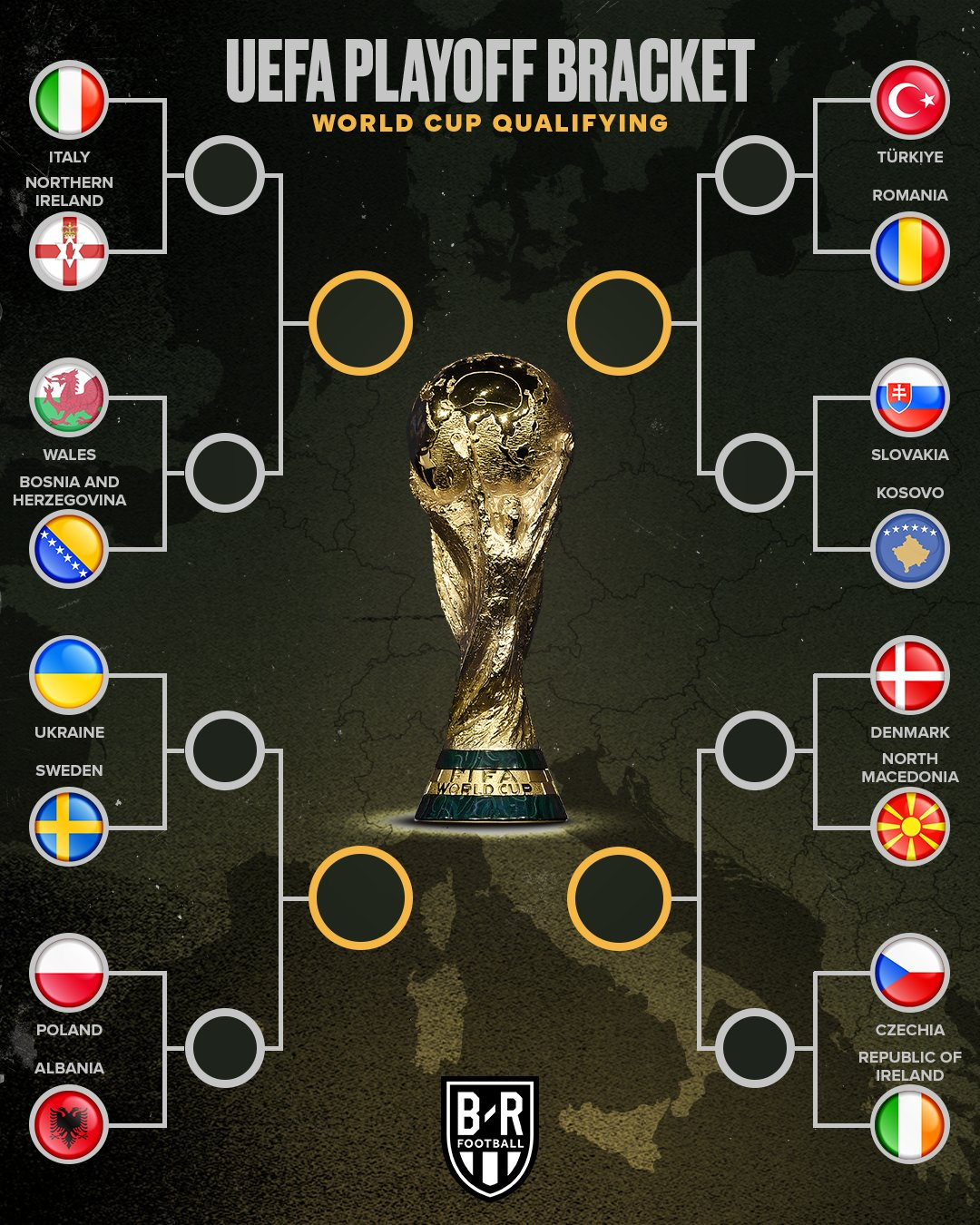 대진 추첨 결과 ▲이탈리아(FIFA 랭킹 12위)-북아일랜드(69위) vs 웨일스(32위)-보스니아헤르체고비나(71위·패스A) ▲우크라이나(28위)-스웨덴(43위) vs 폴란드(31위)-알바니아(63위·패스B) ▲슬로바키아(45위)-코소보(80위) vs 튀르키예(25위)-루마니아(47위·패스C) ▲체코(44위)-아일랜드(59위) vs 덴마크(21위)-북마케도니아(65위·패스D)의 대진으로 각각 구성됐다.