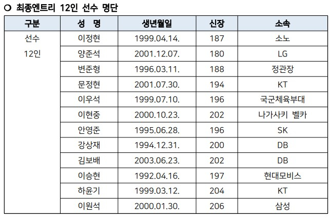 이어 "강상재는 다수의 국제대회에 참가하며 경험을 쌓아온 선수다. 지난 2021년 U19 대표팀에 선발된 바 있는 김보배는 2025-2026시즌 KBL 리그에서 꾸준한 출전과 함께 성장세를 보이고 있다. 특히 김보배는 성인 국가대표팀 첫 발탁인 만큼 젊은 에너지로 대표팀에 신선한 활력을 불어넣어 줄 것으로 기대되고 있다"고 덧붙였다.