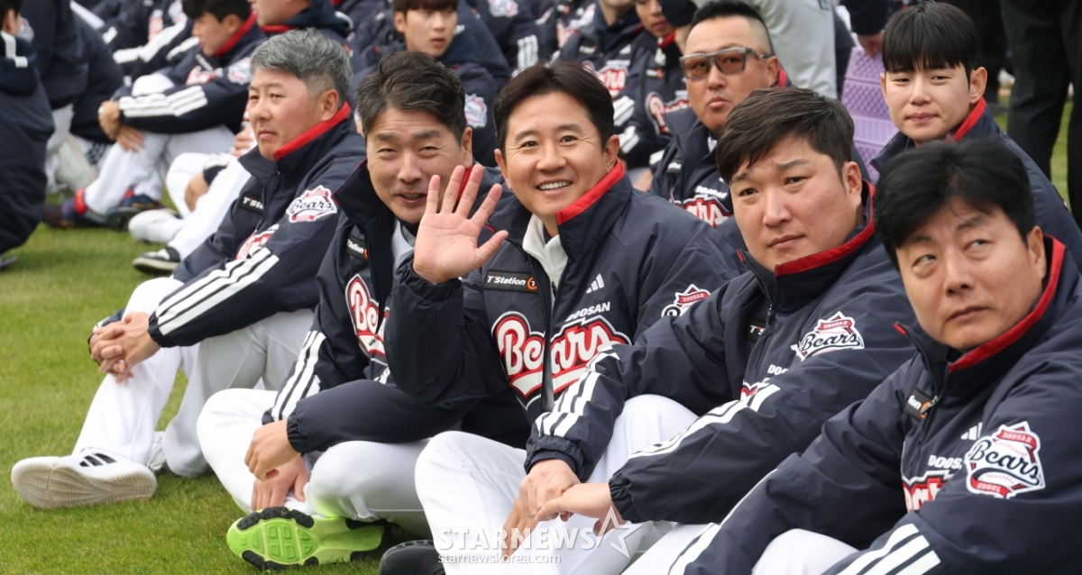 김원형 감독, 홍원기, 손시헌 코치가 입장한 후 포즈를 취하고 있다.
