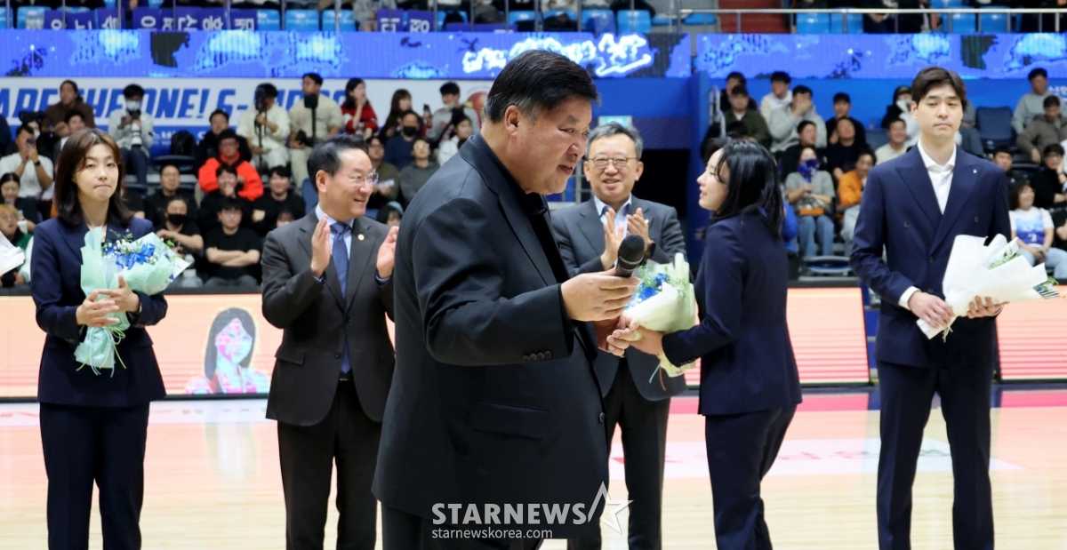 에스버드후원회장인 서정진 셀트리온 회장이 21일 인천 도원체육관에서 열린 2025-2026 WKBL 신한은행과 하나은행의 경기 개막식에서 선수단을 격려하고 있다. 2025.11.21. [포토]'신한은행 선수단에 포상금 약속하는' 서정진 후원회장