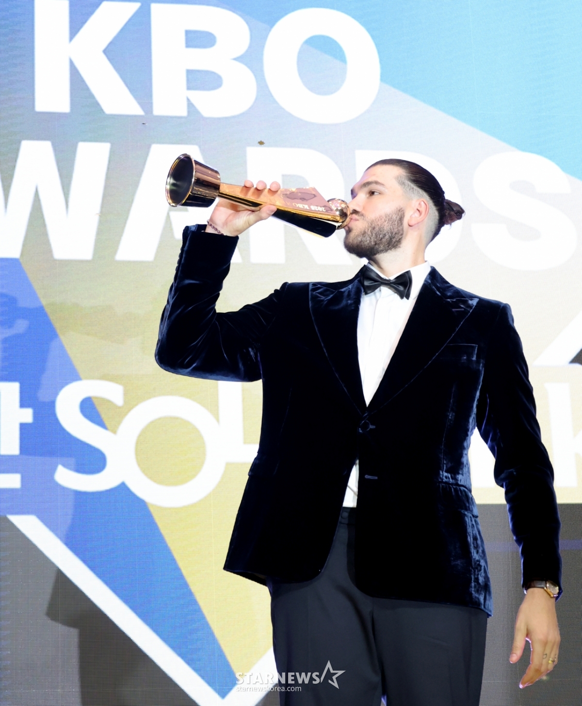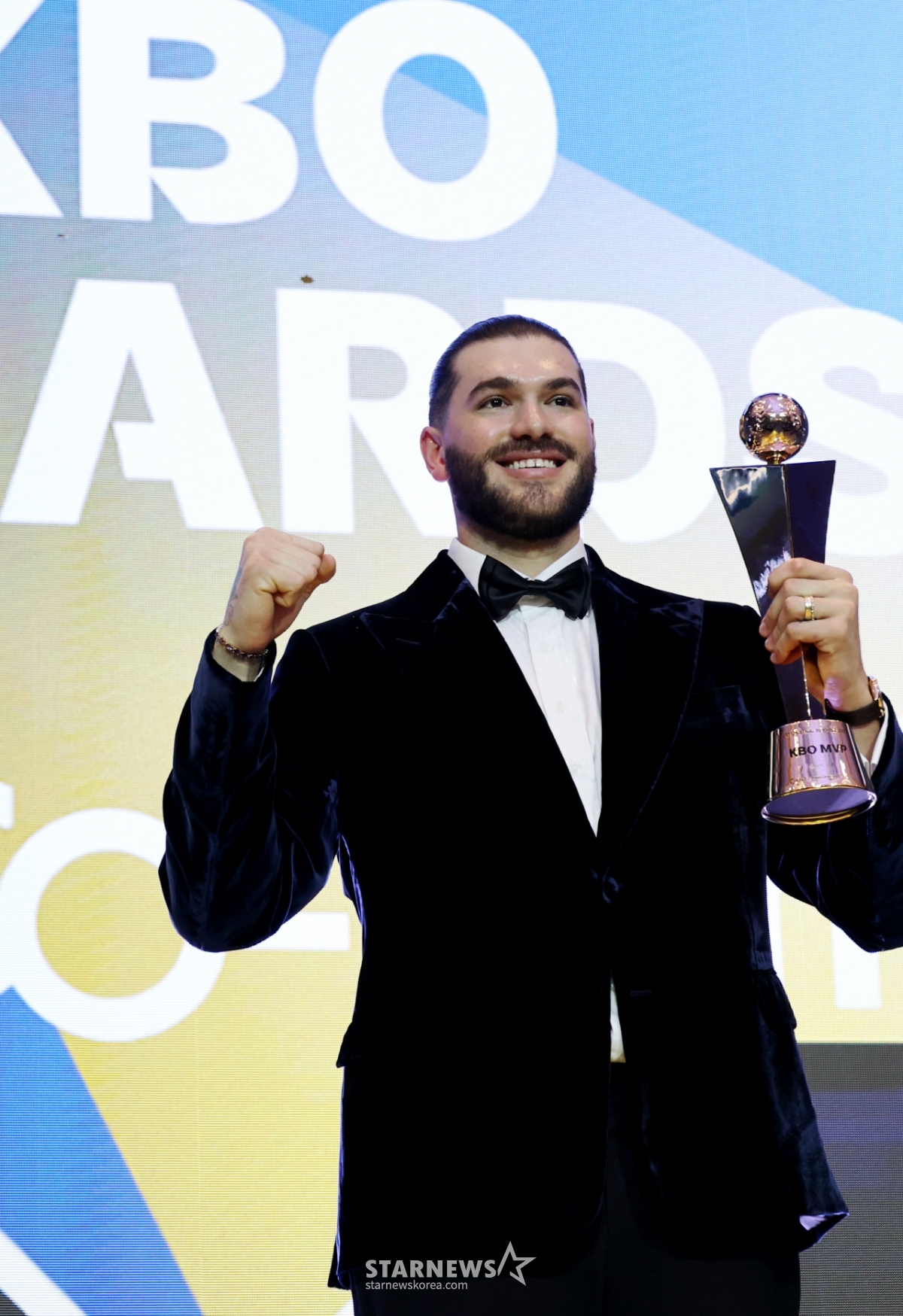 투수 4관왕과 MVP를 수상한 한화의 폰세가 24일 잠실 롯데호텔 월드에서 열린 2025 신한 쏠뱅크 KBO어워즈에서 트로피를 들고 포즈를 취하고 있다. 2025.11.24.