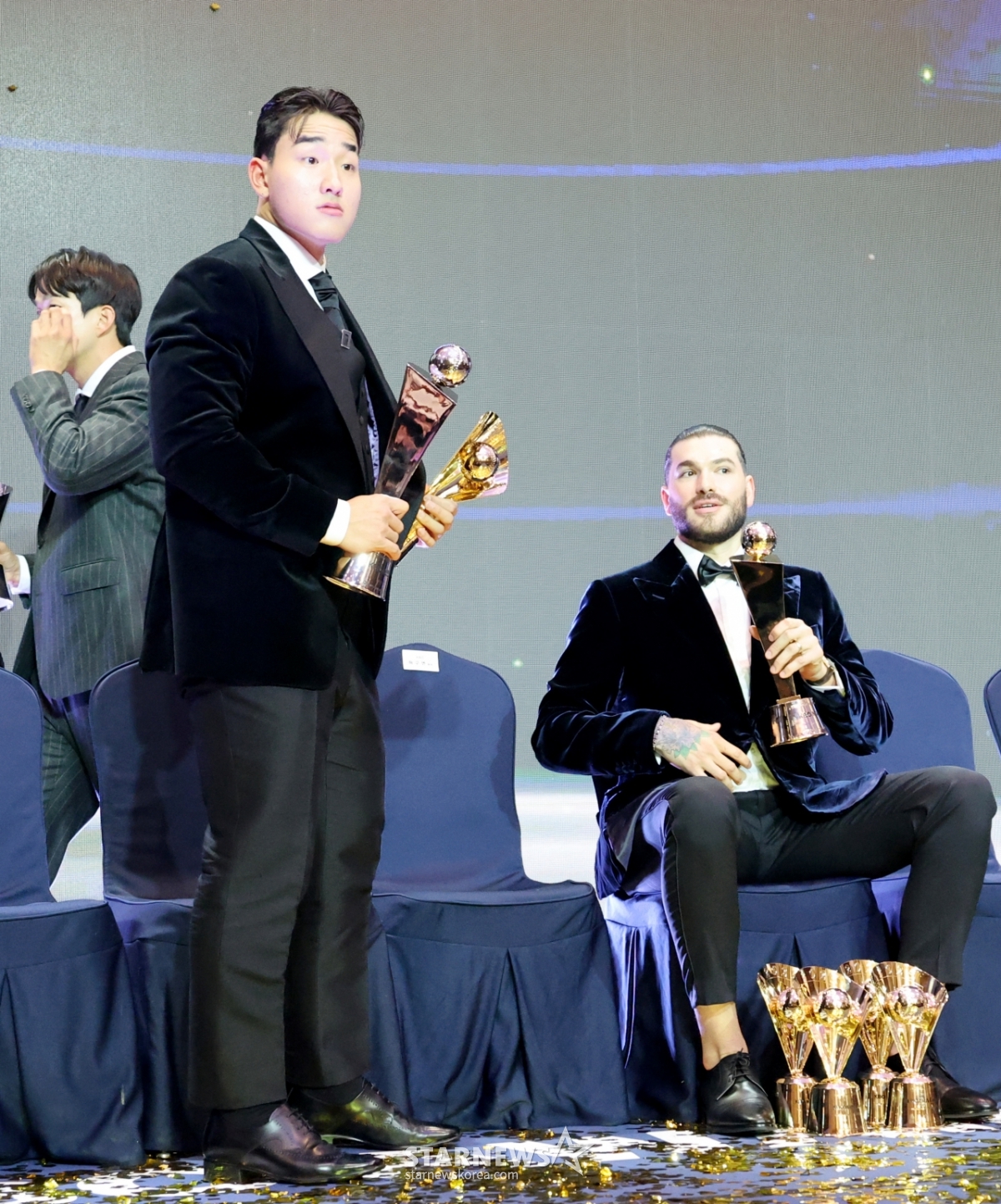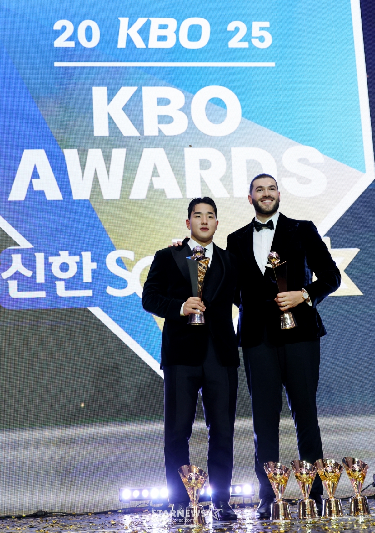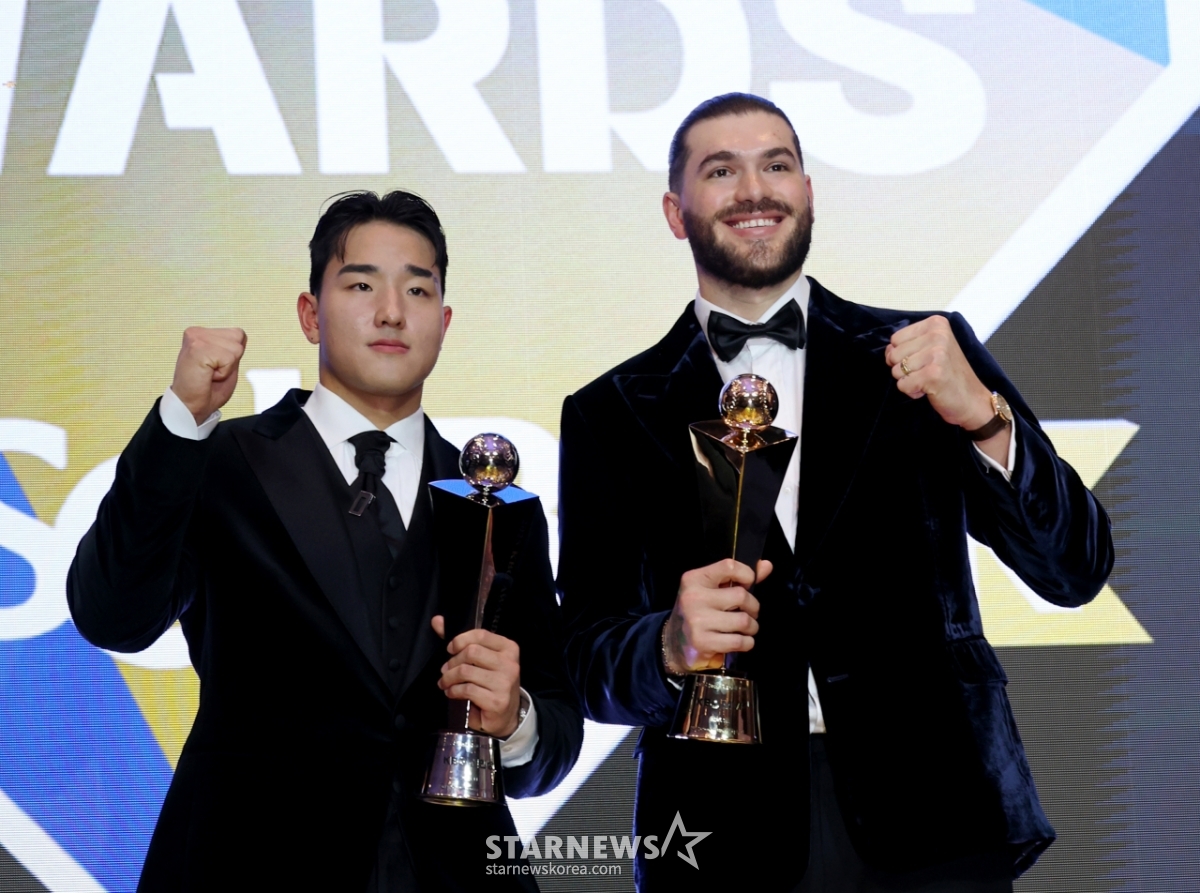 투수 4관왕과 MVP를 수상한 한화의 폰세가 신인황 KT 안현민과 4일 잠실 롯데호텔 월드에서 열린 2025 신한 쏠뱅크 KBO어워즈에서 트로피를 들고 포즈를 취하고 있다. 2025.11.24.