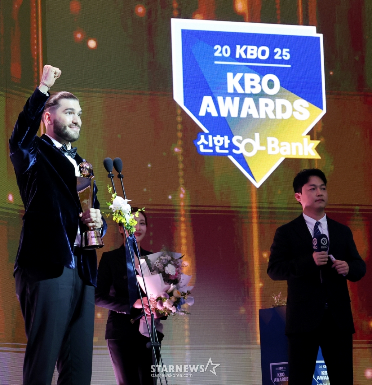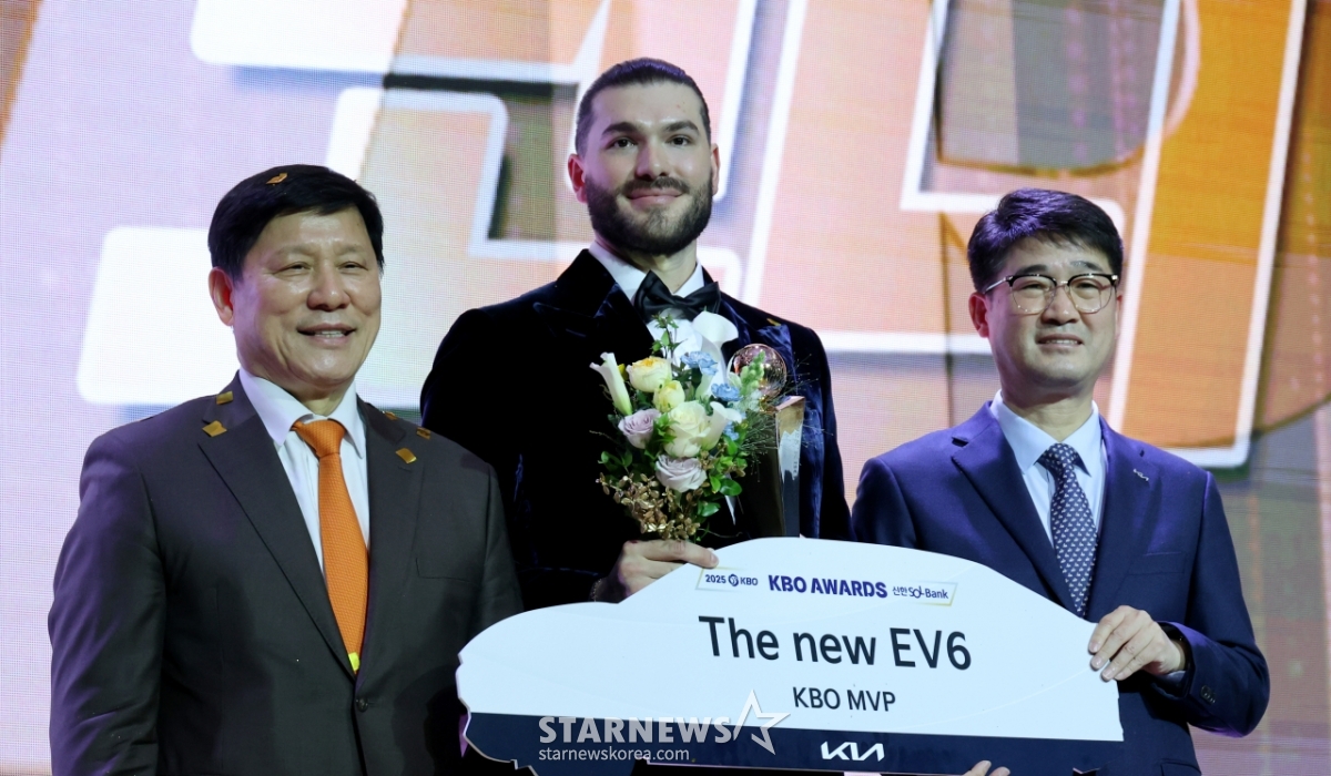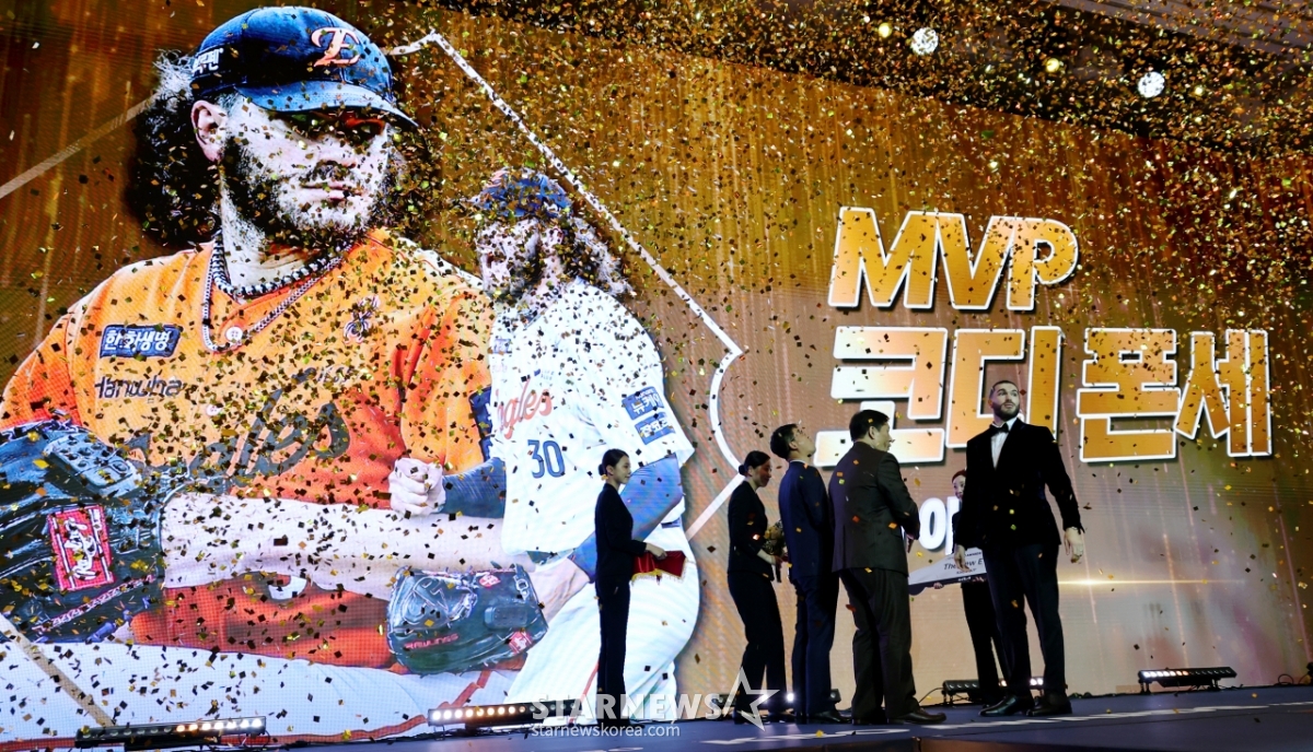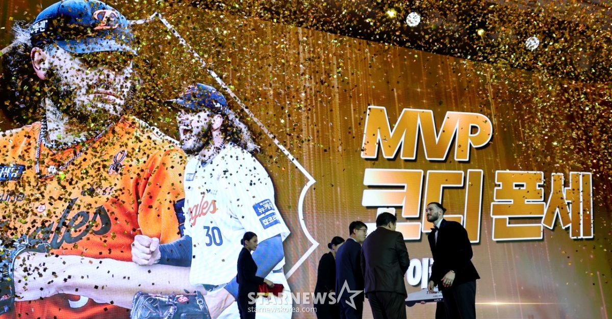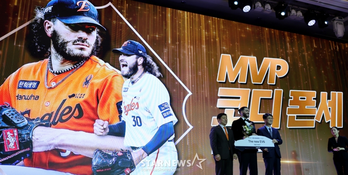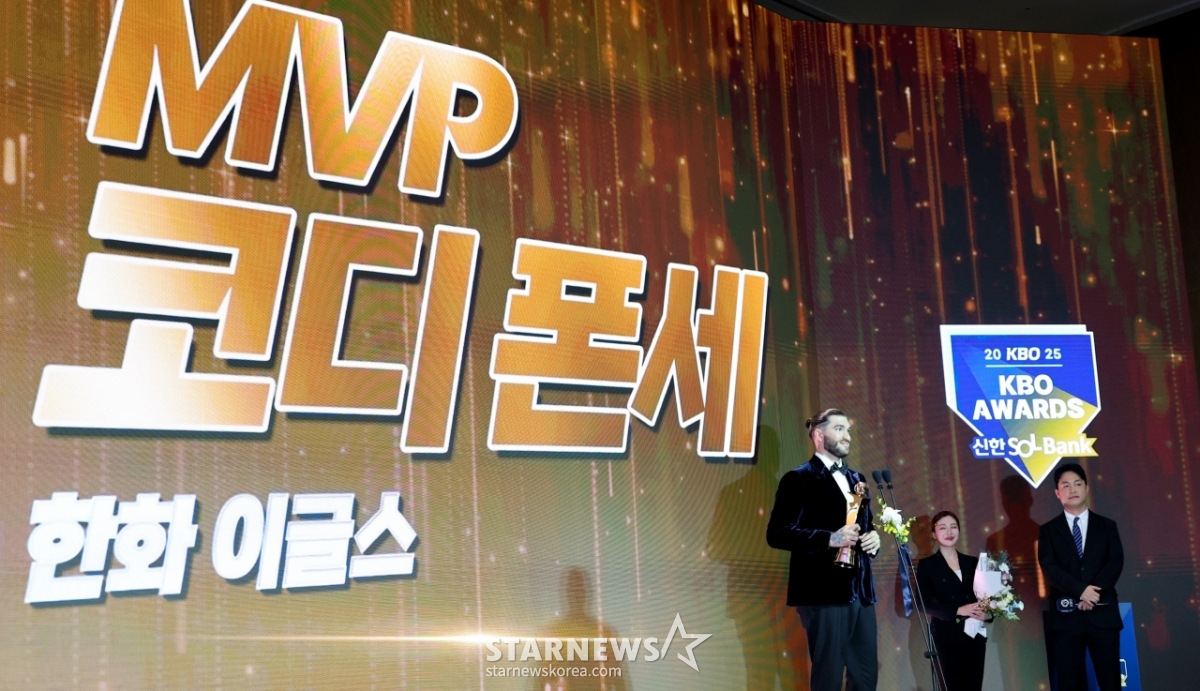 한화 투수 폰세가 2025 KBO 어워즈에서 투수4관왕 및 MVP로 선정되며 트로피를 수상했다.