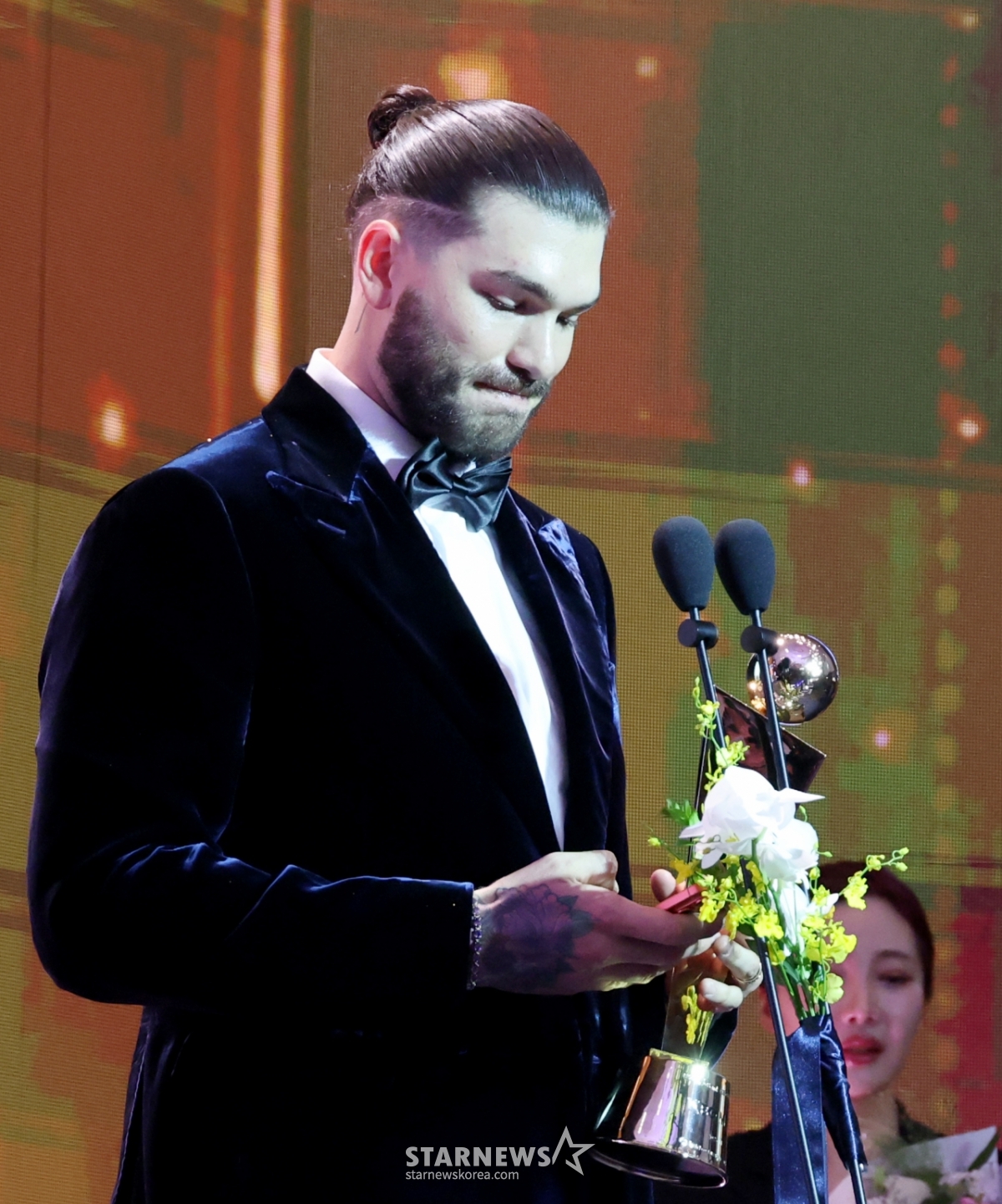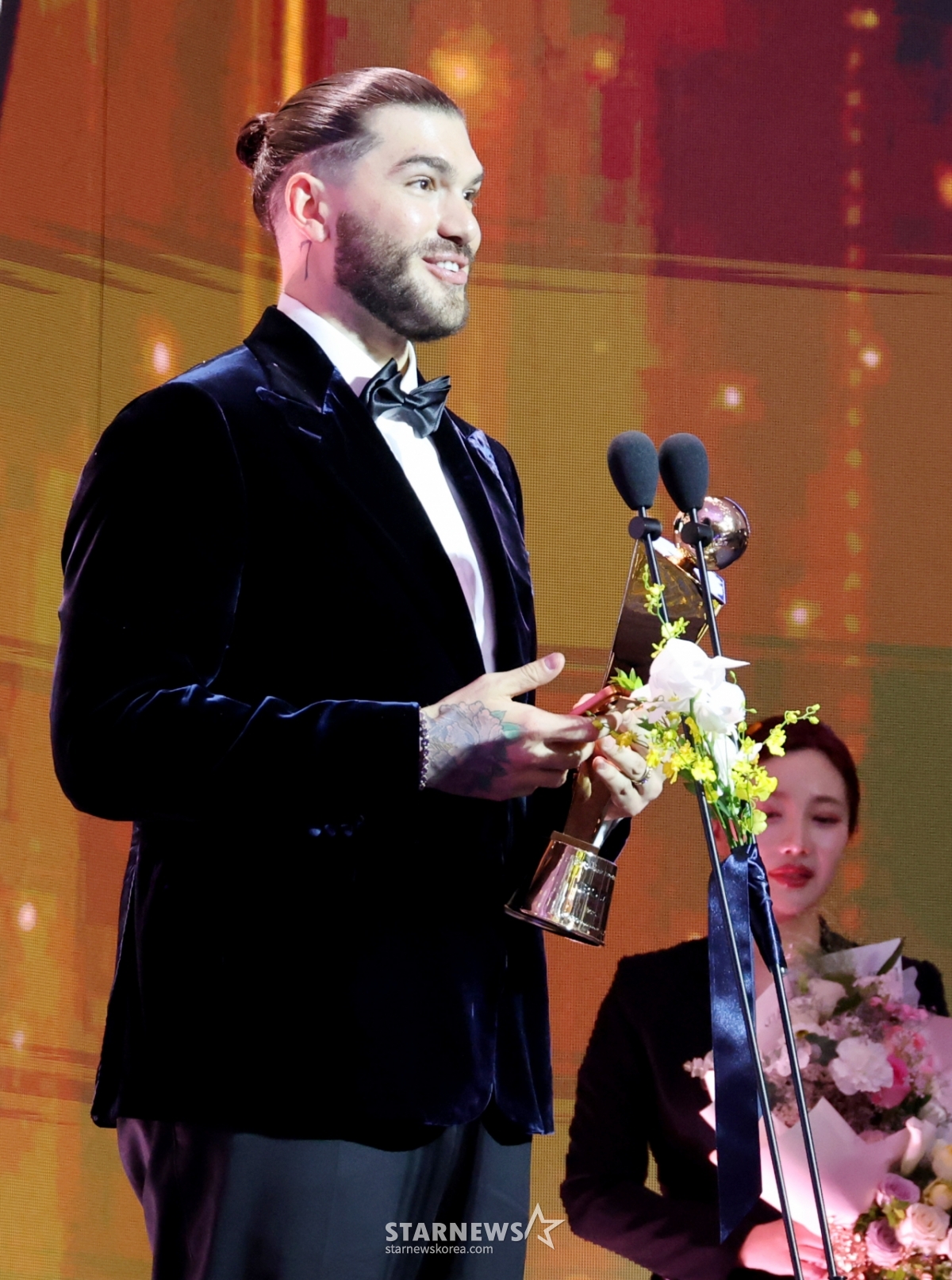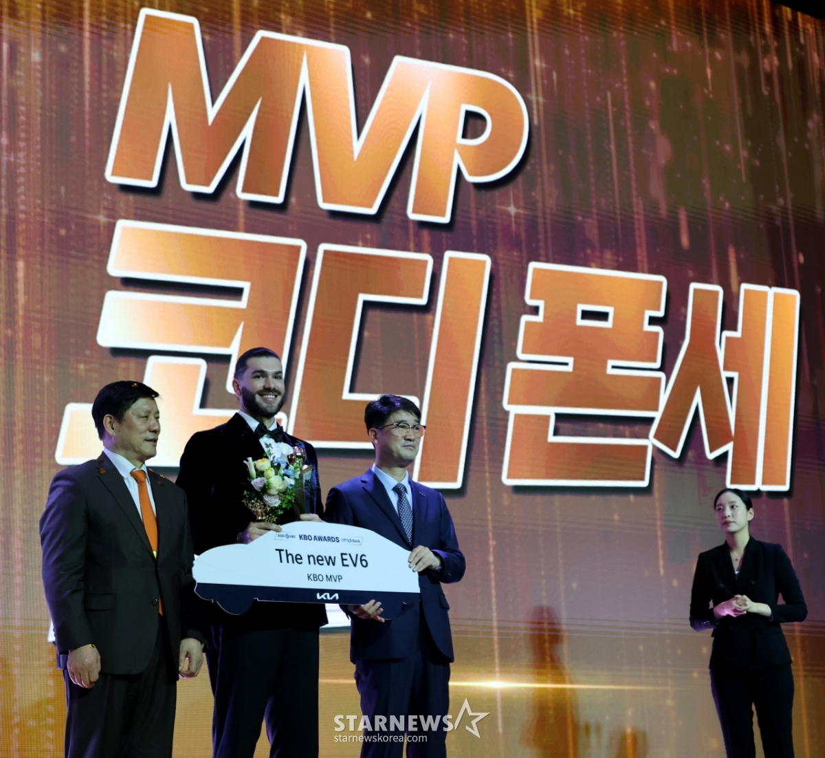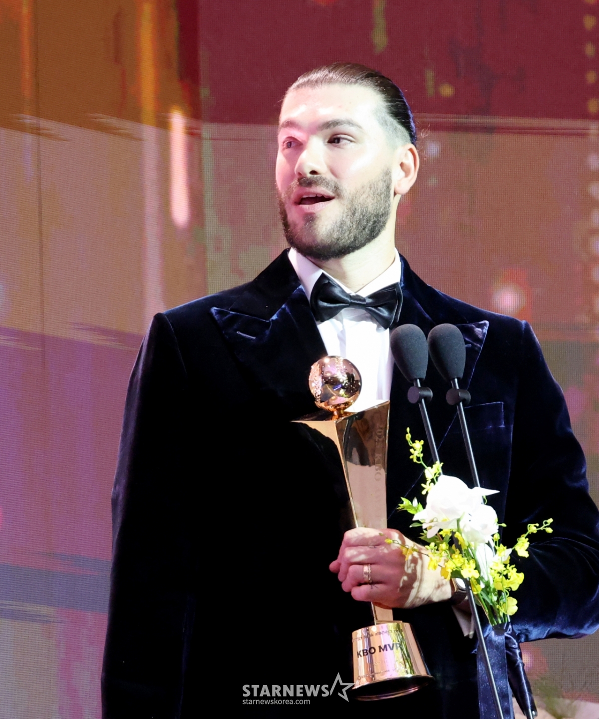 한화 투수 폰세가 2025 KBO 어워즈에서 투수4관왕 및 MVP로 선정되며 트로피를 수상했다.