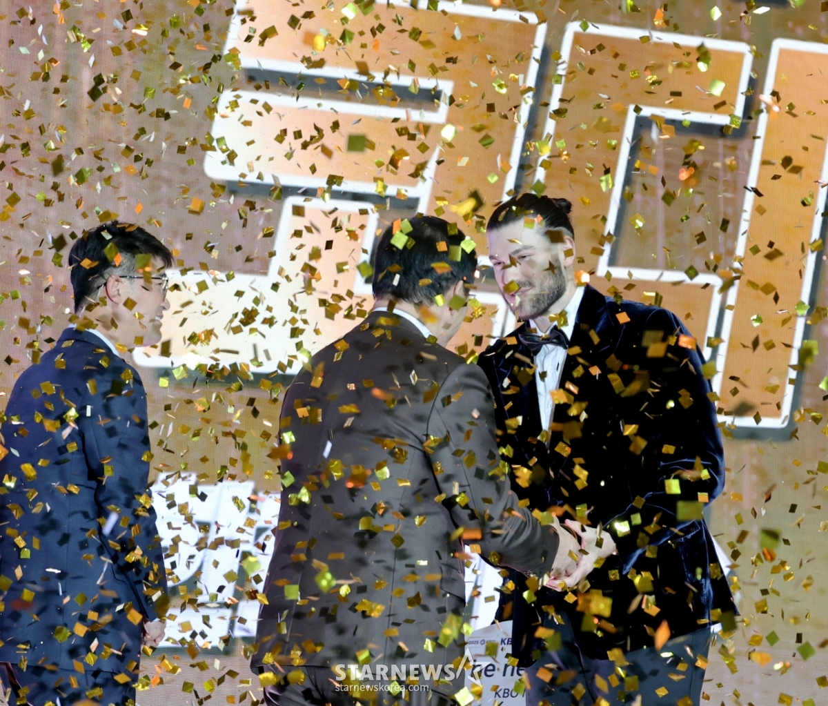 투수4관왕과 MVP를 수상한 한화 폰세가 4일 잠실 롯데호텔 월드에서 열린 2025 신한 쏠뱅크 KBO어워즈에서 허구연 총재로부터 트로피를 수상하고 있다. 2025.11.24.