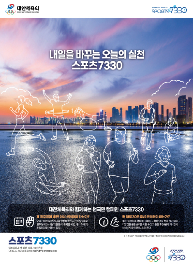 이런 현실 속에서 대한체육회(회장 유승민)는 최근 의미 있는 움직임을 보여주고 있다. 그중 하나가 바로 '스포츠 7330'이라는 범국민 캠페인이다. 언뜻 보면 복잡한 숫자로 보이지만, 의미를 알면 간단하다. 먼저 숫자 '7'은 일주일의 7일을 뜻한다. '3'은 3회 이상의 운동 횟수를 의미하며, 뒤에 이어져 나오는 '30'은 30분 이상의 운동을 말한다. 즉, 한 번 운동할 때 30분 이상 실시하며 그런 운동을 최소 일주일에 3회 이상 실천하자는 캠페인이다. 그래야 스포츠 생리학적으로 지방 분해, 소모 등의 운동 효과를 얻을 수 있다는 연구 결과가 나와 있다.