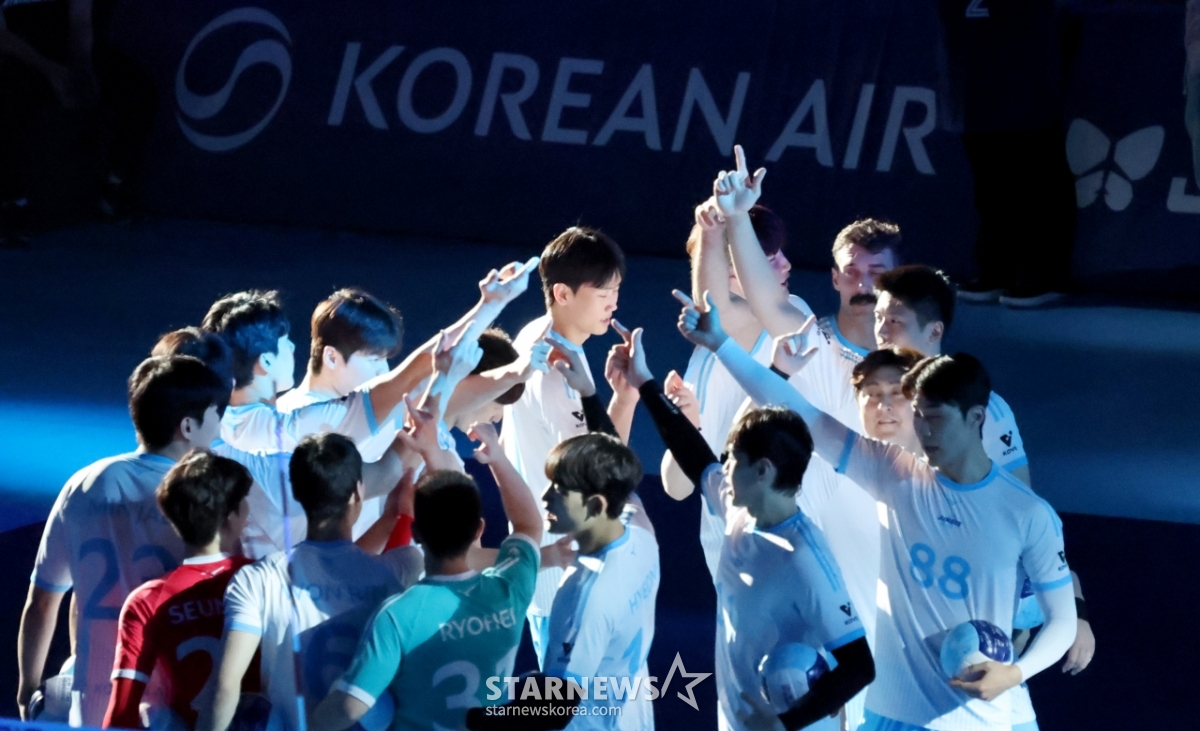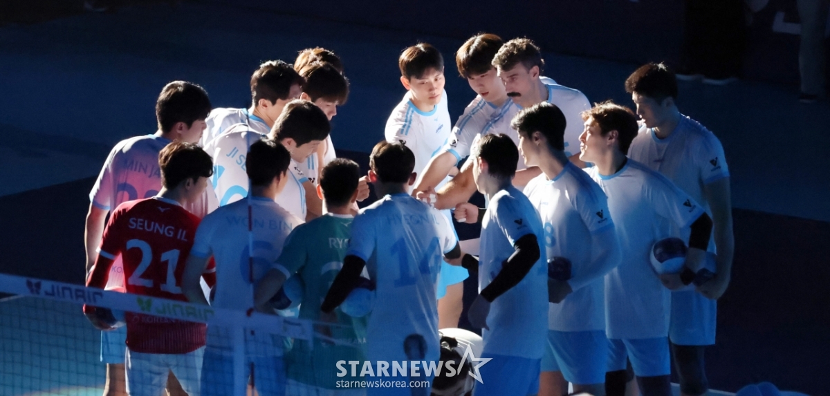 대한항공 선수들이 25일 인천 계양체육관에서 열린 2025-2026 진에어 V리그 대한항공과 KB손해보험과의 경기에서 선전을 다짐하는 화이팅을 외치고 있다. 2025.11.25.