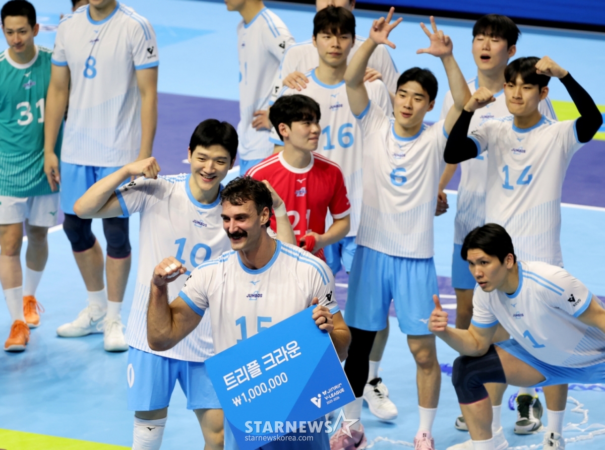 다만 이후 마지막 남은 서브 에이스가 좀처럼 터지지 않았다. 강력한 서브로 상대 리시브를 거듭 흔들었으나 직접 득점으로 연결되는 장면이 좀처럼 나오지 않았다. 다잡은 트리플크라운을 놓친 듯 보였던 3세트 24-22 상황. 러셀은 마지막 퍼즐을 기어코 채웠다. 강력한 스파이크서브를 상대 코트에 내리 꽂았다. 세트 스코어 3-0으로 경기에 마침표를 찍는 순간이자, 트리플크라운을 완성하는 순간이었다. 트리플크라운 상금은 100만원이다.