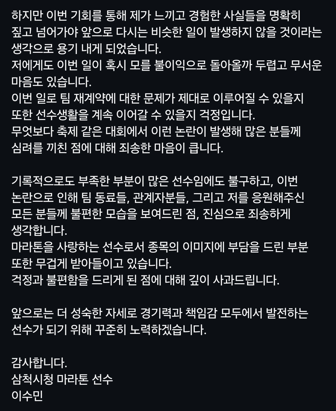 2025 인천국제마라톤 결승선에서 포착된 삼척시청 김완기 감독의 부적절 접촉 논란이 새로운 국면을 맞고 있다. 논란 직후 김 감독이 "선수를 잡아준 것일 뿐"이라고 해명한 데 이어 당사자인 선수 이수민이 직접 반박문을 공개하며 당시 상황과 감정을 구체적으로 밝혔다.