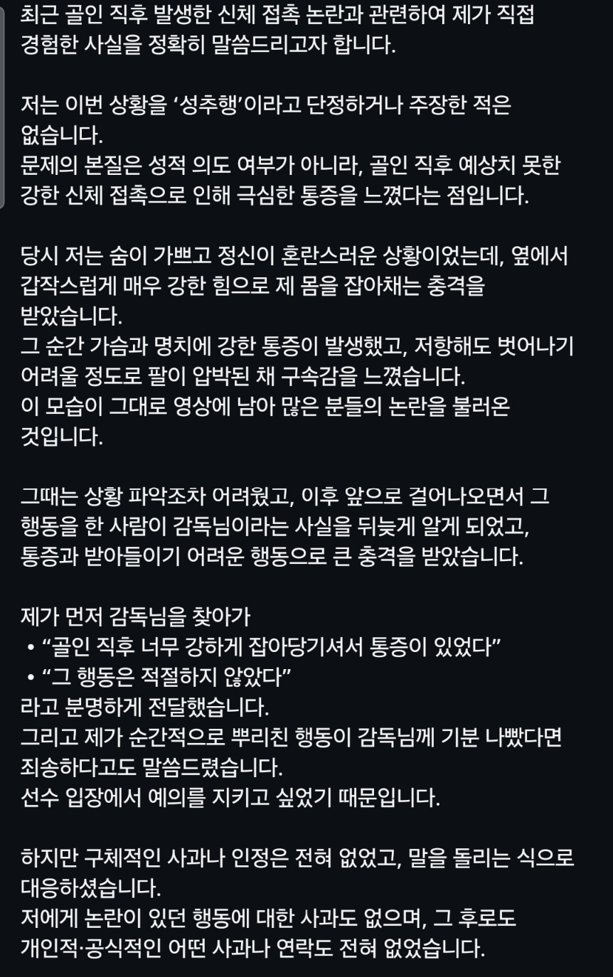 하지만 이수민은 25일 오후 개인 사회관계망서비스(SNS)를 통해 장문의 개인 입장문을 공개하며 감독의 해명과는 상당히 다른 설명을 내놓았다. 그는 "이번 상황을 성추행이라고 단정하거나 주장한 적은 없다"면서도 "문제의 핵심은 성적 의도가 아니라 경기 직후 예상치 못한 강한 신체 접촉으로 인한 극심한 통증을 느꼈다는 점"이라고 밝혔다.