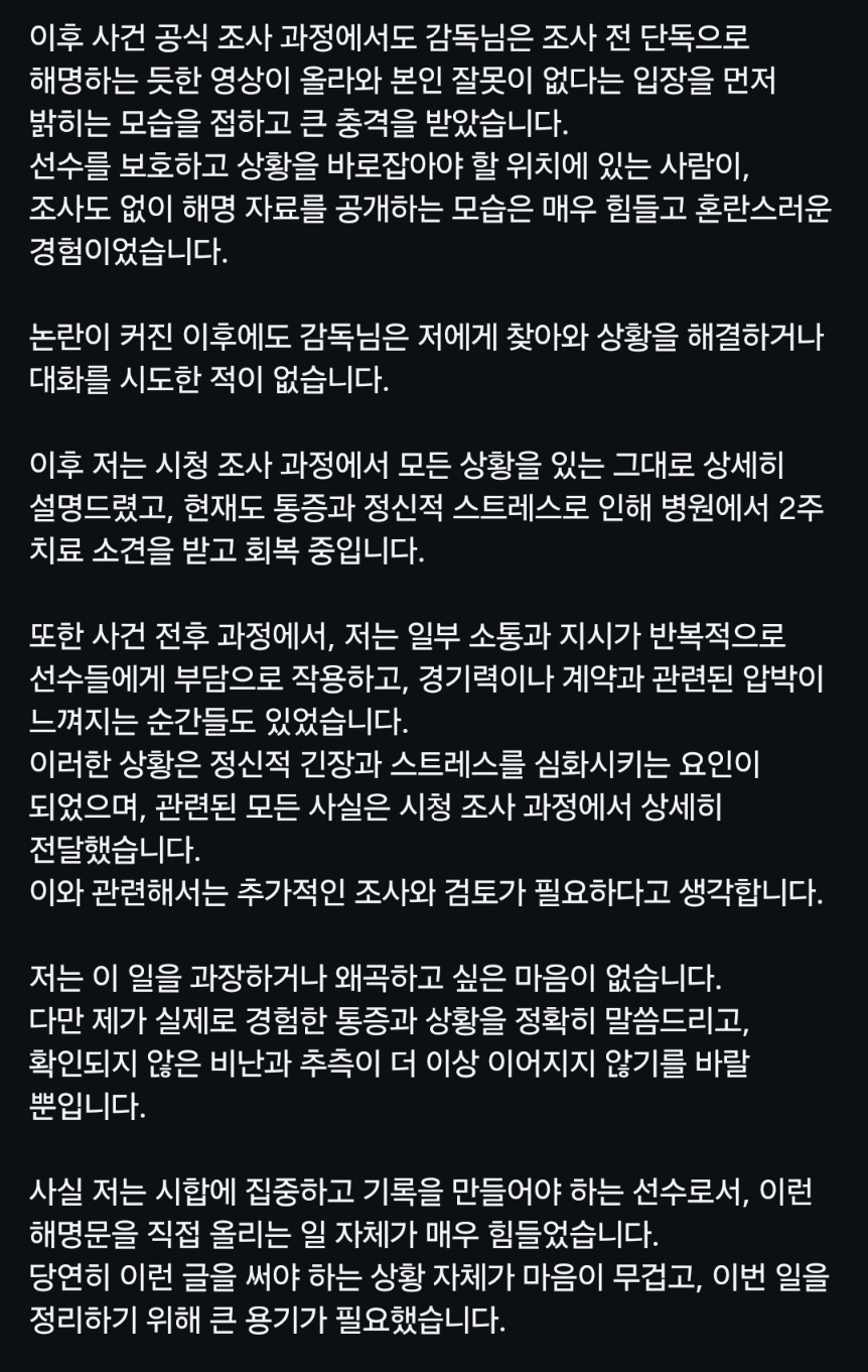 현재 통증과 정신적 스트레스까지 극심한 상황임을 털어놨다. 이수민은 "통증과 스트레스로 병원에서 2주 진단을 받았다"며 "아울러 사건 전후로 일부 소통 방식과 지시가 선수들에게 압박으로 작용한 순간들이 있었다. 대회 준비와 계약 문제와 관련해 부담을 느낀 적도 있다. 관련 문제는 시청 조사 과정에서 상세히 전달했다"고 했다.