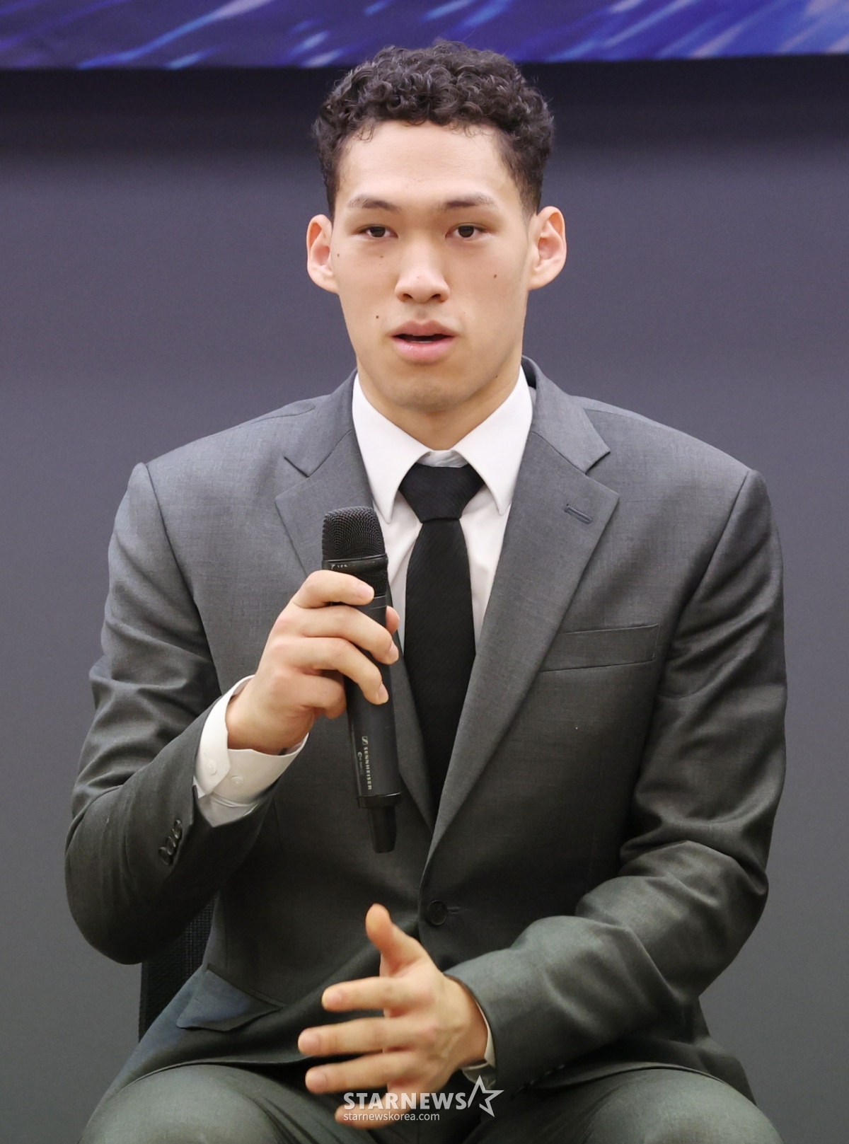 에디 다니엘(용산고·서울 SK)이 농구 부문 대상을 수상한 후 기자회견에서 기자들의 질문에 답하고 있다.