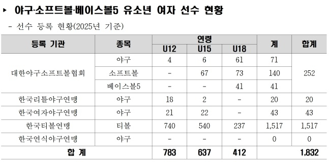 그동안 여성들의 야구 참여는 대부분 티볼 및 소프트볼로 이뤄졌다. 티볼, 소프트볼뿐 아니라 연식야구도 활발한 일본과 달리 우리나라 등록된 여자 인구 수는 턱없이 부족하다. 연식야구에 정식 등록된 여자 야구 선수는 전 연령 통틀어 전무하고, 여자야구는 고등학교만 돼도 할 곳이 없어진다. 소프트볼은 여자야구 유소년 선수들이 중학교 이후 할 수 있는 대체재로 여겨진 것이 현실이다.